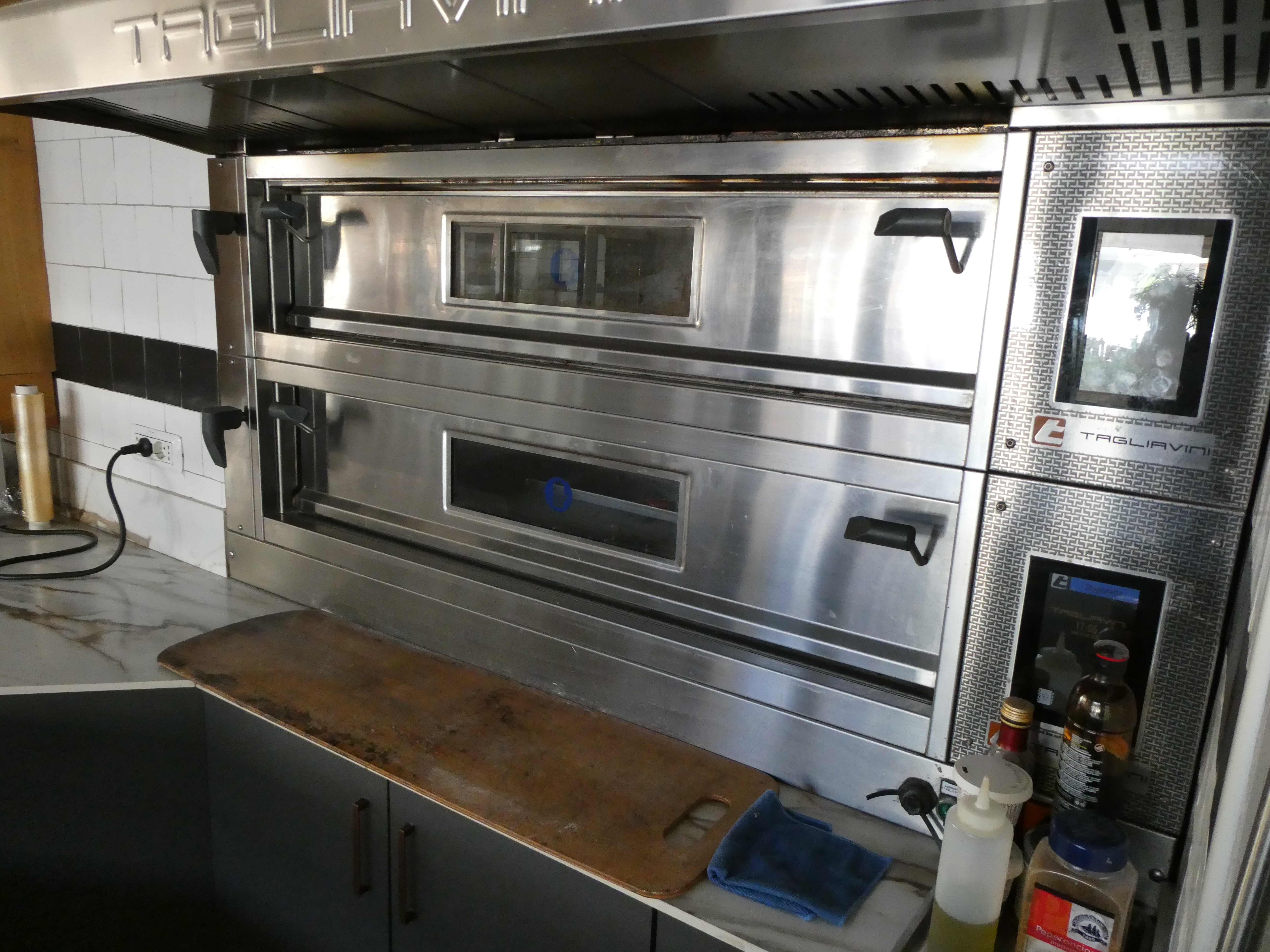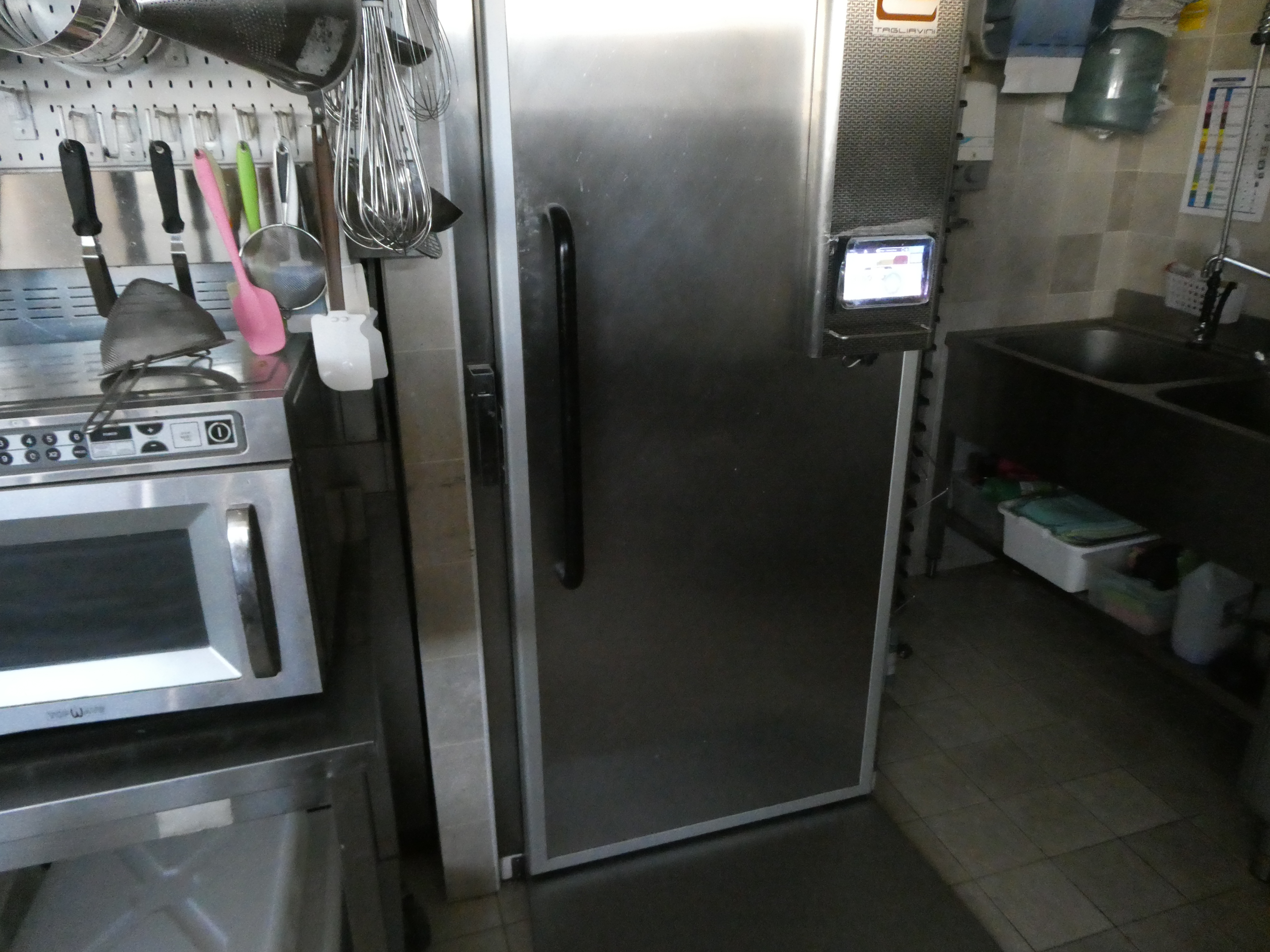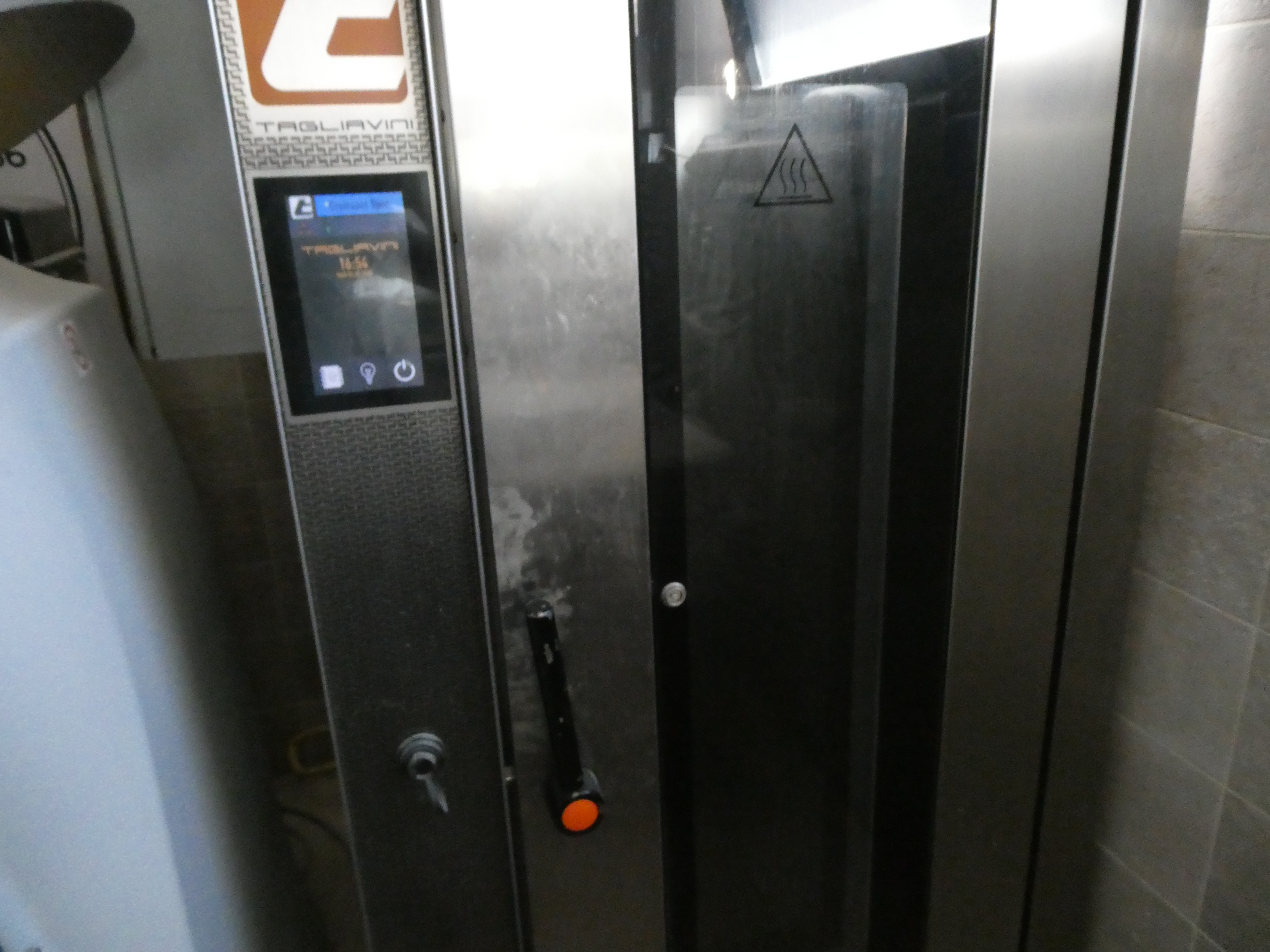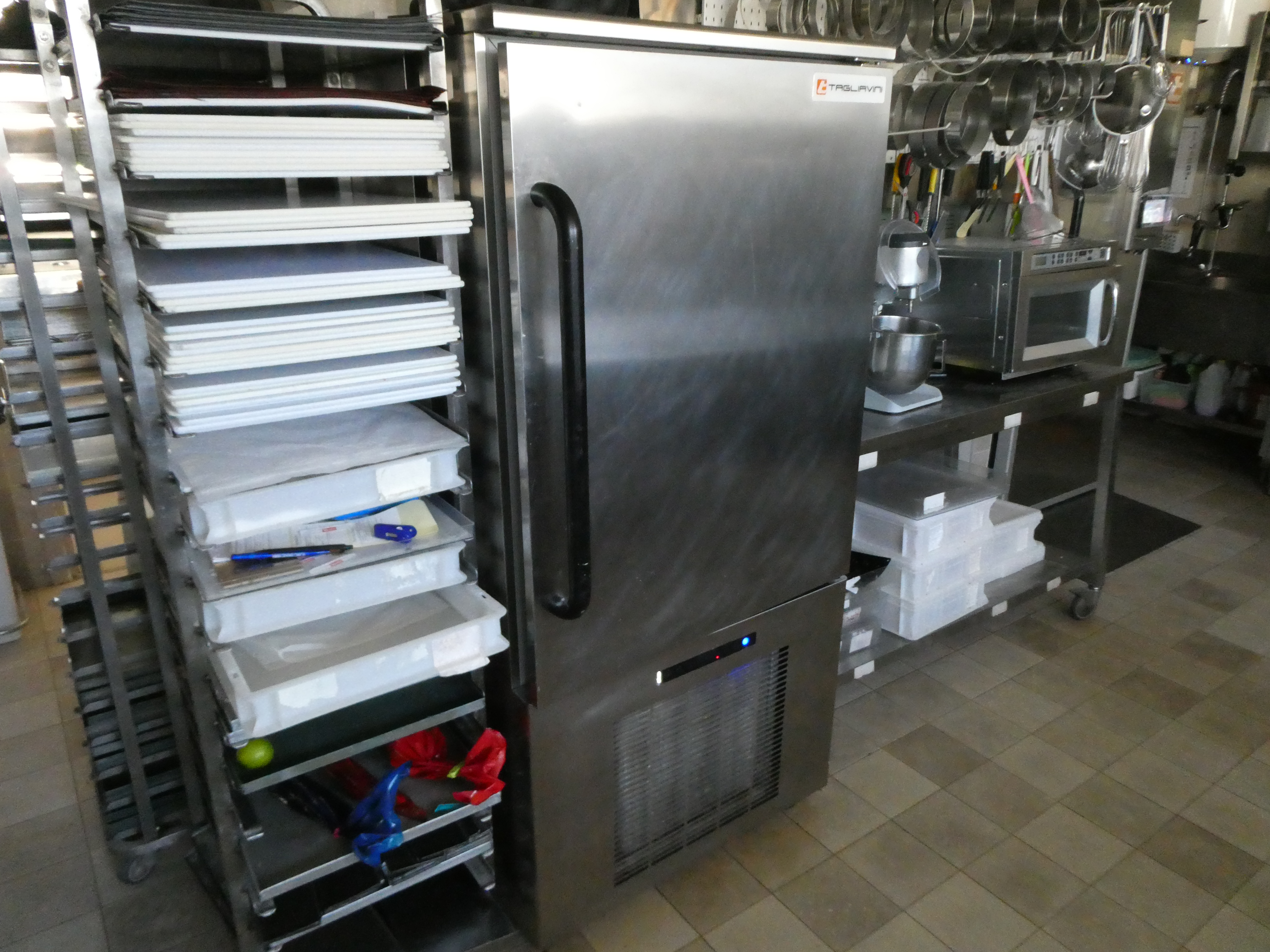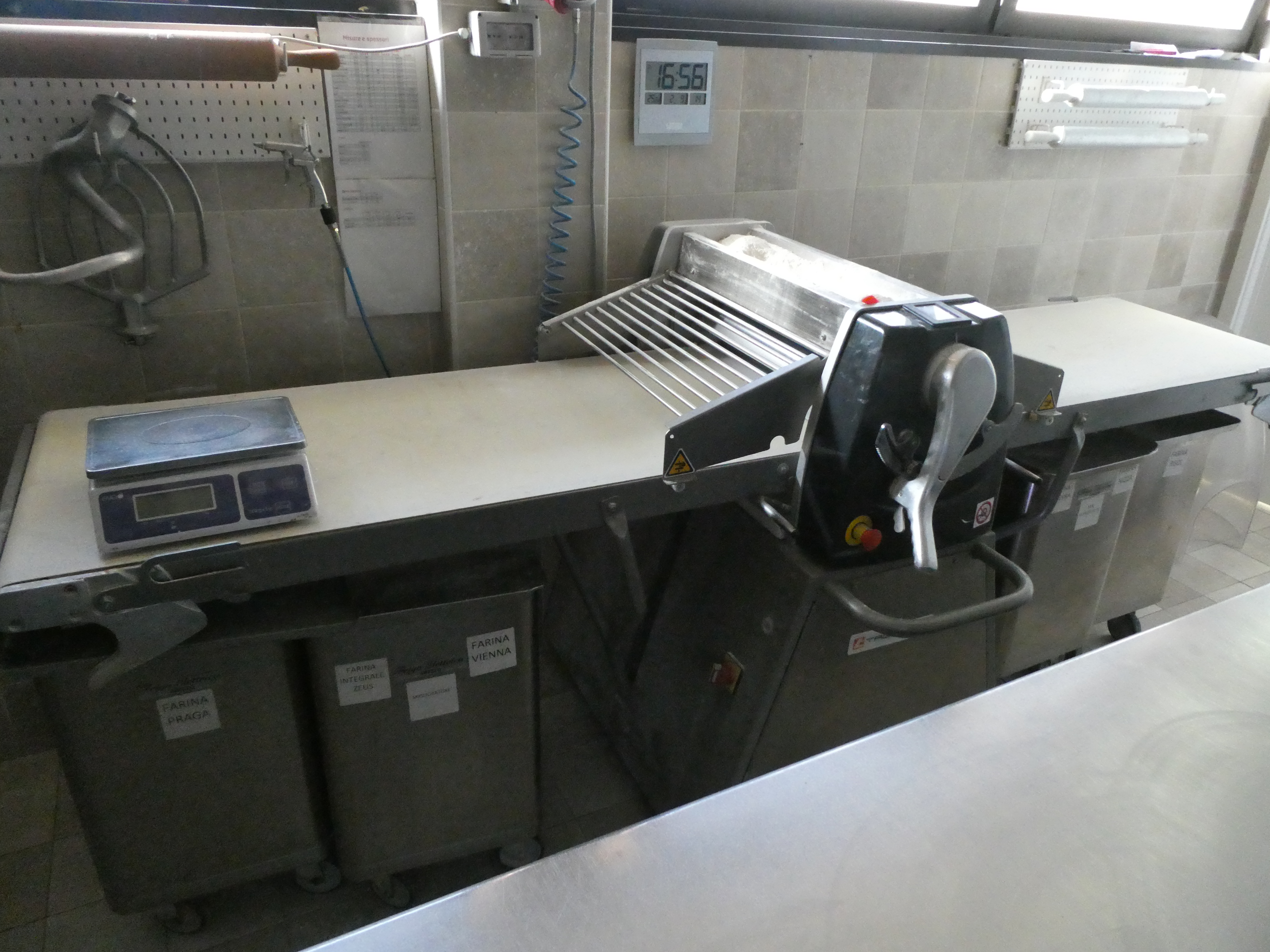 Forno Tagliavini a una camera, 2 carrelli e cappa: sfogliatrice Tagliavini semiautomatica; abbattitore Tagliavini 10 teglie; cella ferma lievitazione Tagliavini; impastatrice a braccio; planetaria Tagliavini 50 lt con gancio frusta foglia; lavastoviglie industriale Krupps; forno Tagliavini a 2 camere.