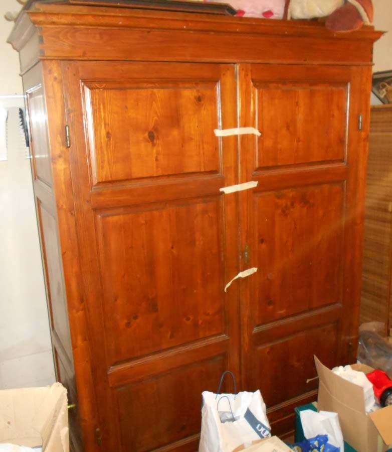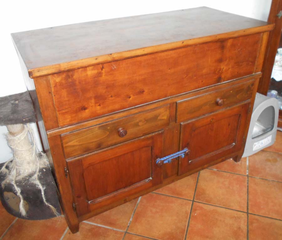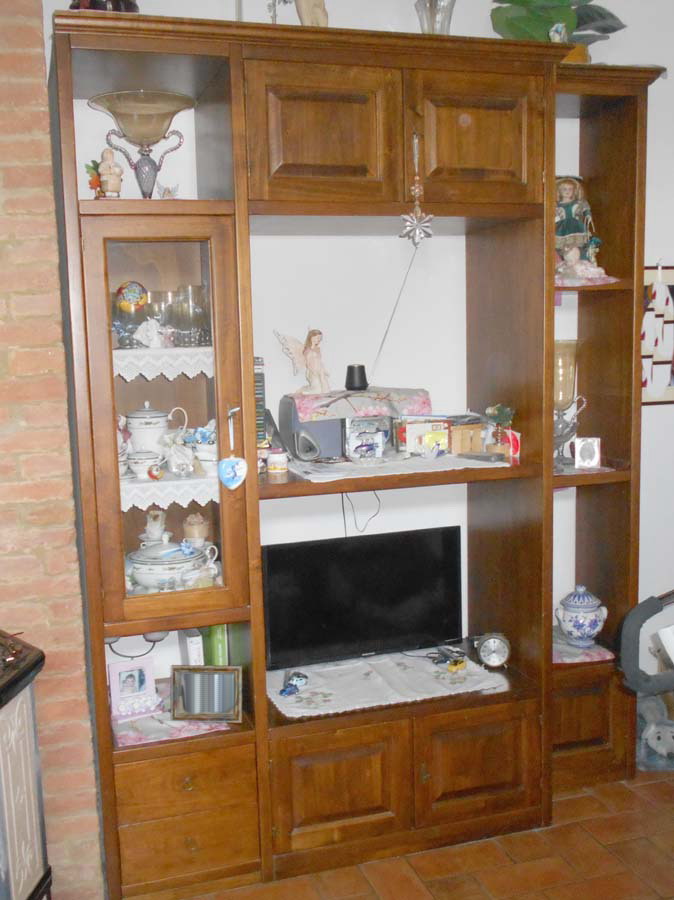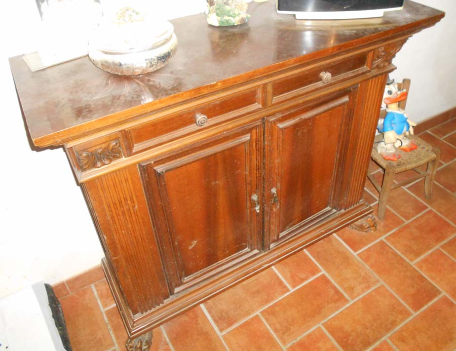 Mobile soggiorno in legno scuro; mobile basso con 2 ante e cassetto; armadio in legno scuro; mobile tipo madia.
