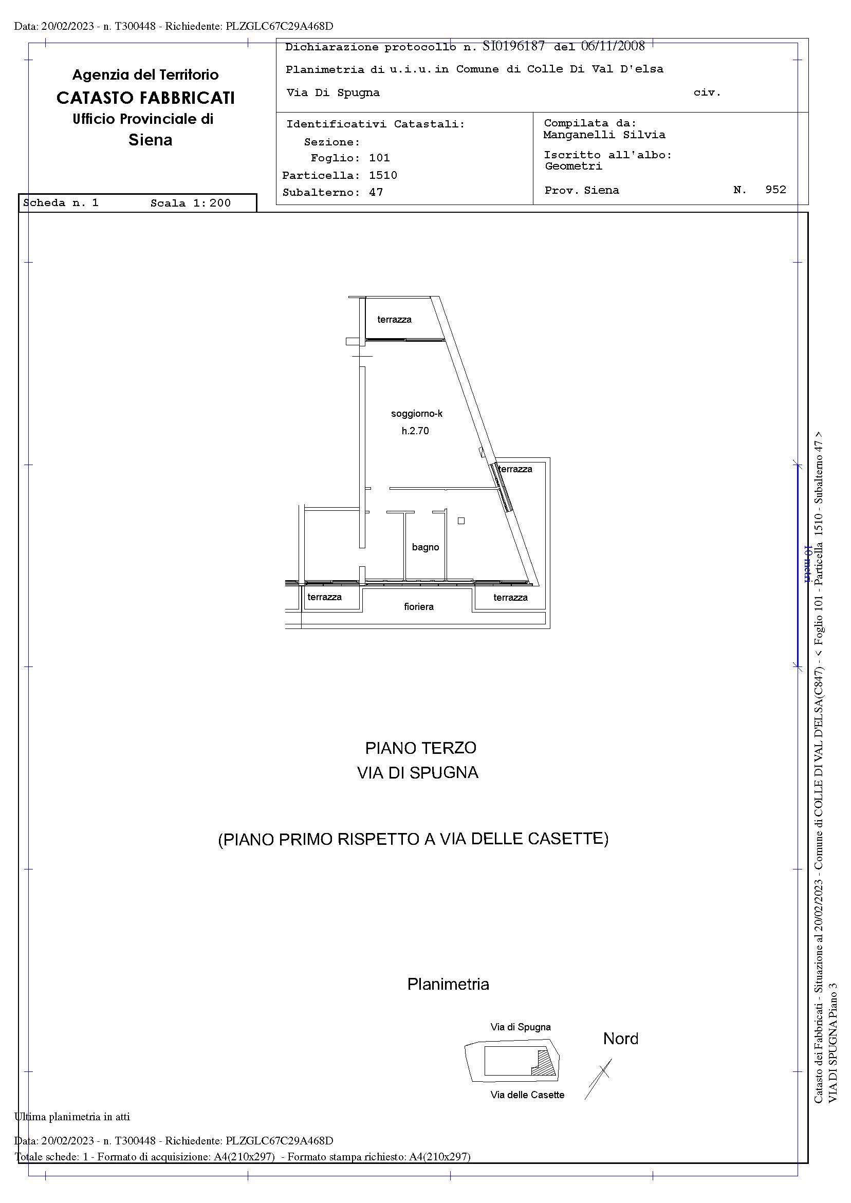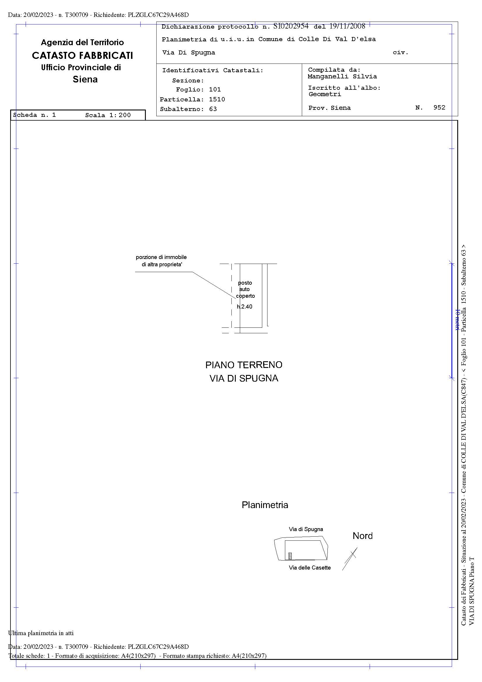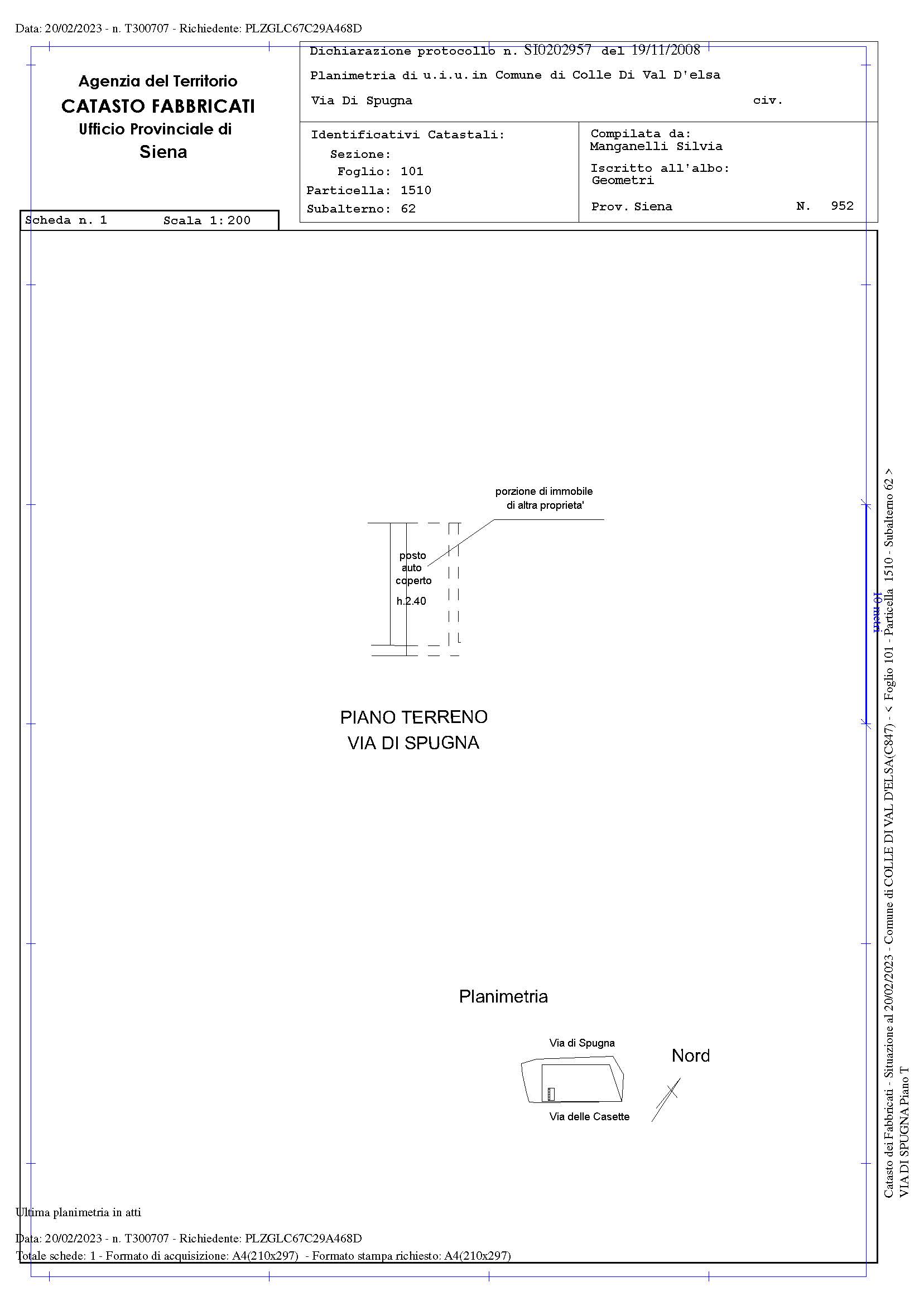 L'unità immobiliare risulta censita al Catasto Fabbricati del Comune di Colle di Val d'Elsa al Foglio 101 particella 1510 subalterno 47 (Cat. A/2, classe 3, consistenza 5 vani, superficie catastale totale 103 mq, superficie catastale totale escluse aree scoperte 93 mq,, rendita € 568,10, piena proprietà per l’intero), subalterno 62 (Cat. C/6, classe 1, consistenza 5 mq, superficie catastale totale 5 mq., rendita € 7,75, proprietà superficiaria per l'intero), subalterno 63 (Cat. C/6, classe 1, consistenza 12 mq, superficie catastale totale 13 mq, rendita € 18,59, piena proprietà per l'intero) oltre beni comuni non censibili.