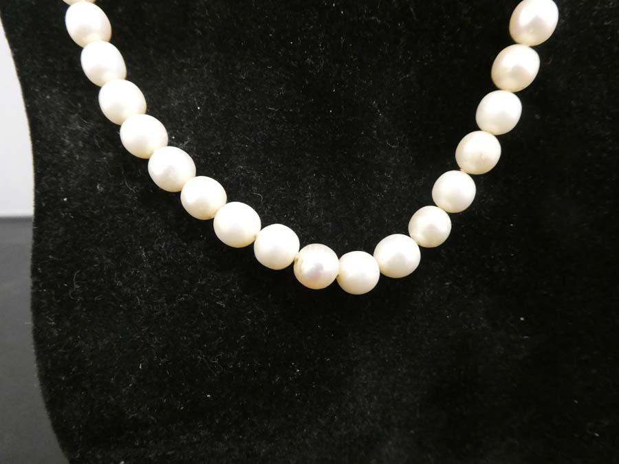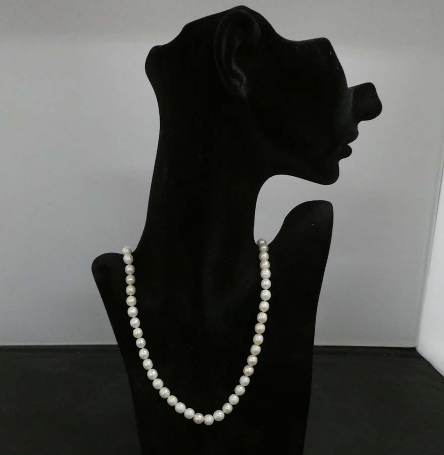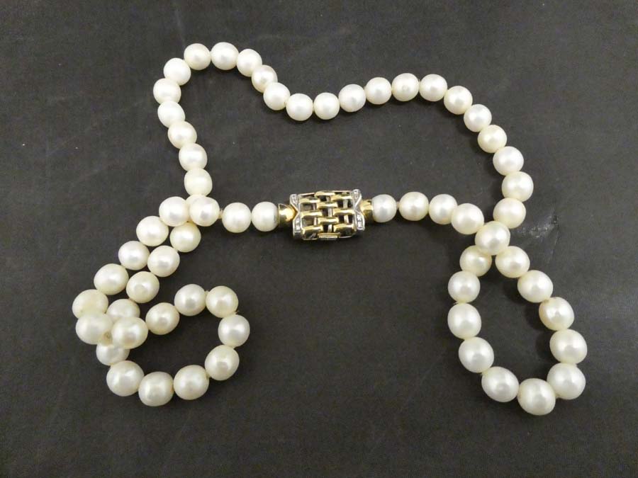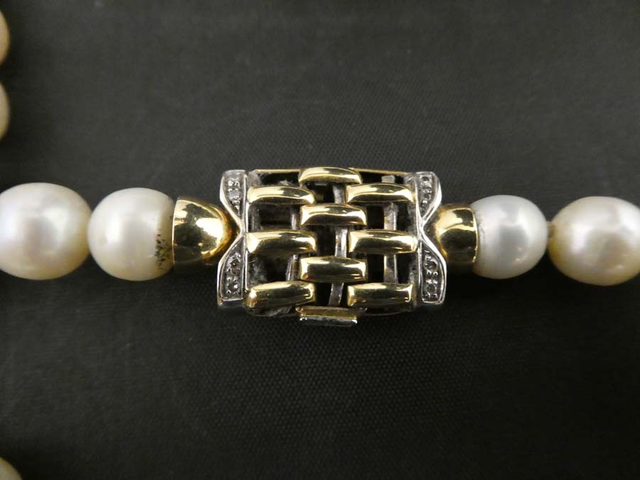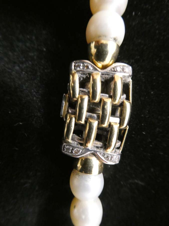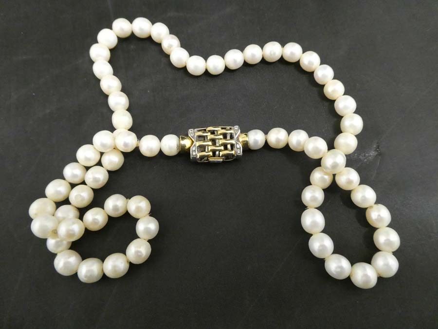 Collana di perle (non certificate) con chiusura in oro, lunghezza totale 56 cm.