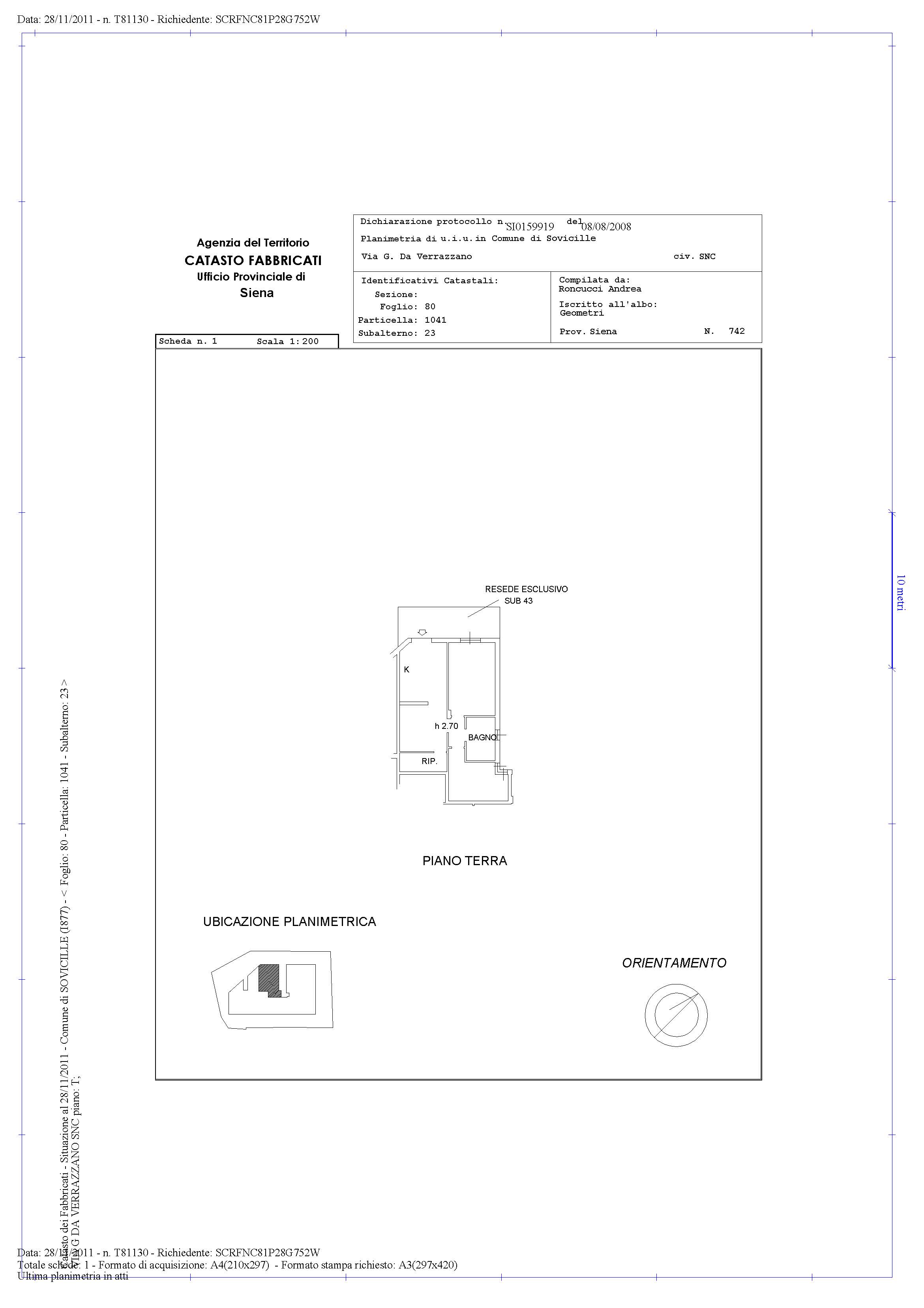 L’unità immobiliare risulta censita al Catasto Fabbricati del Comune di Sovicille al Foglio 80, particella 1041, subalterni 23 e 43 graffati (Cat. A/3, classe U, consistenza 5 vani, rendita € 464,81), particella 1041 subalterno 7 (Cat. C/2, classe 3, consistenza mq 6 catastali, rendita € 13,63), particella 1041 subalterno 8 (Cat. C/2, classe 6, consistenza mq 9 catastali, rendita € 33,47) e particella 1041 subalterno 9 (Cat. C/6, classe 6, consistenza mq 15 catastali, rendita € 37,96).