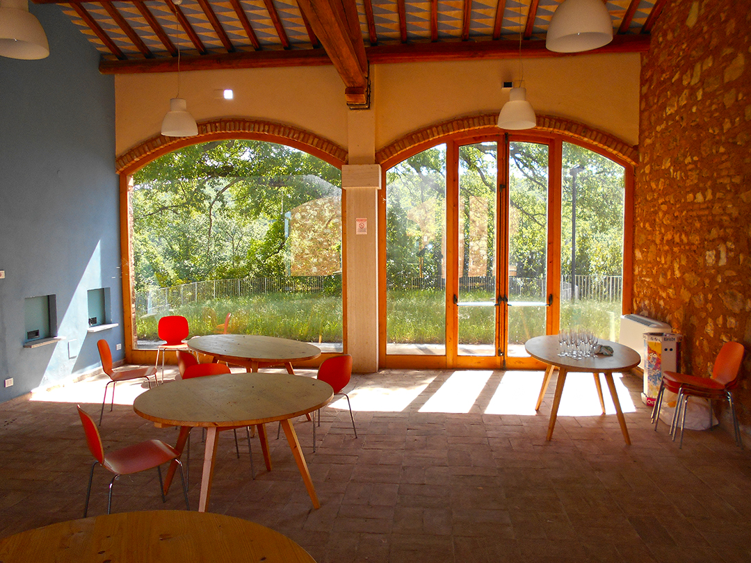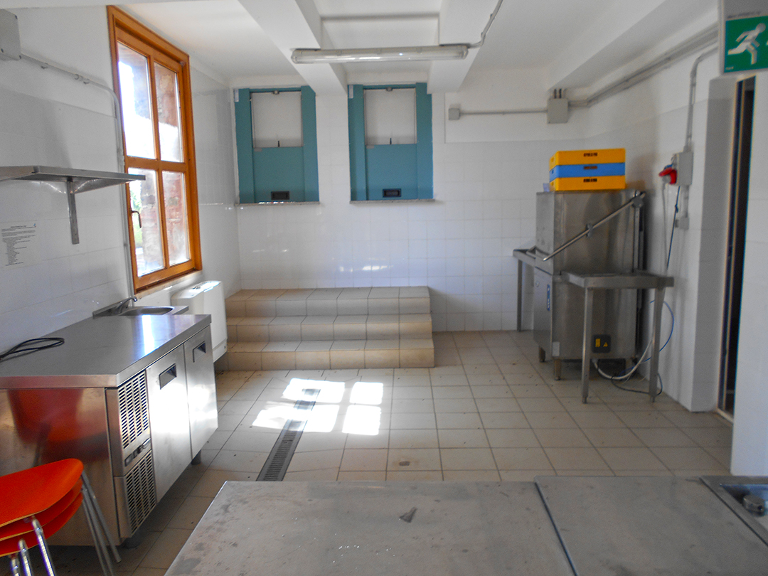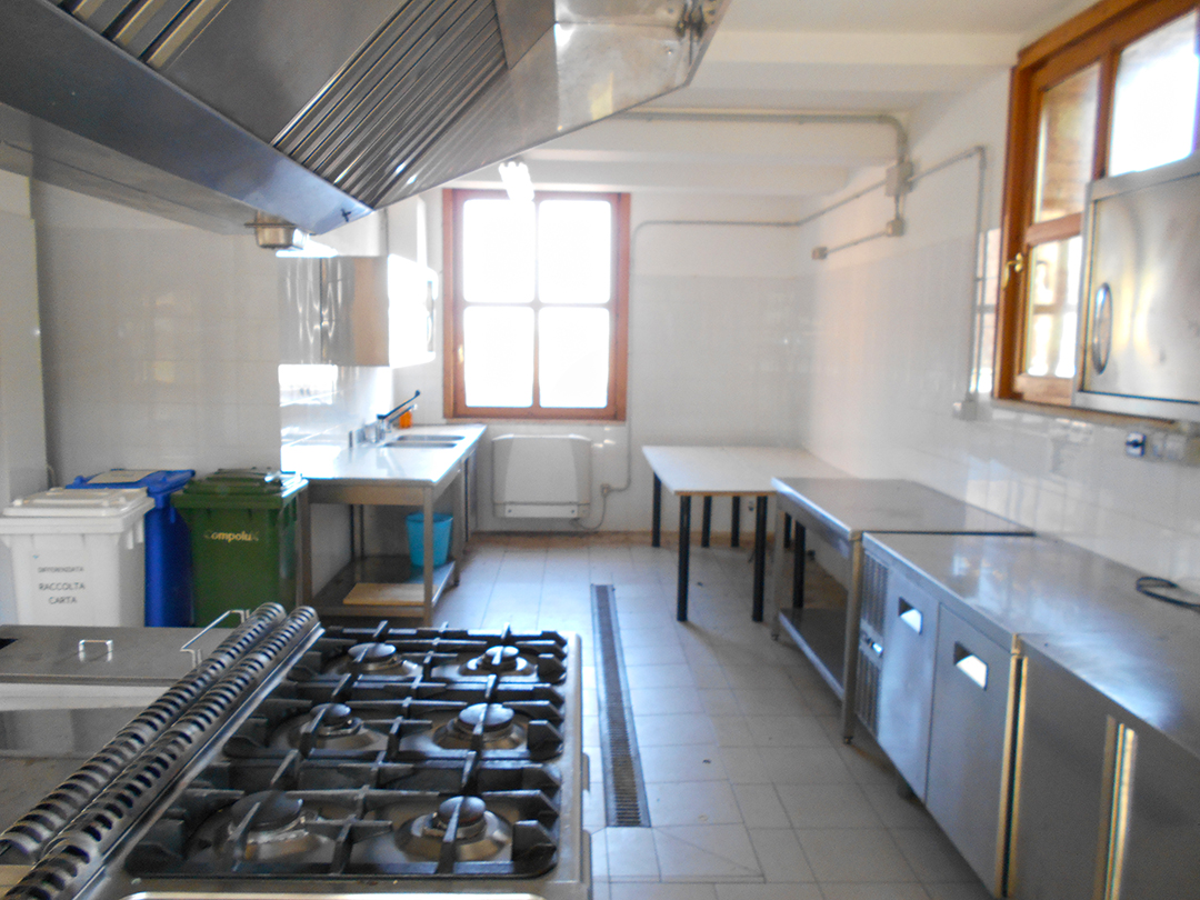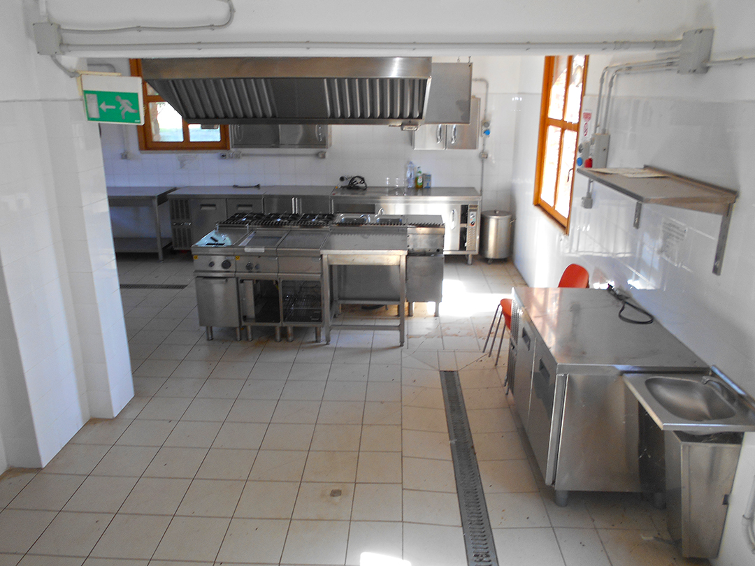 3) edificio secondario destinato alla ristorazione ed ulteriori aule. Al piano terra, è presente un’ampia zona ristorante, con grandi finestrature, comprensiva di dispensa e due servizi per complessivi circa 125 mq calpestabili, a cui si aggiunge il locale cucina completo di bagno di circa 60 mq.