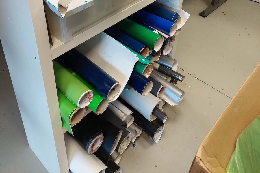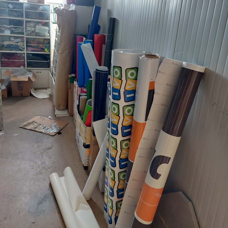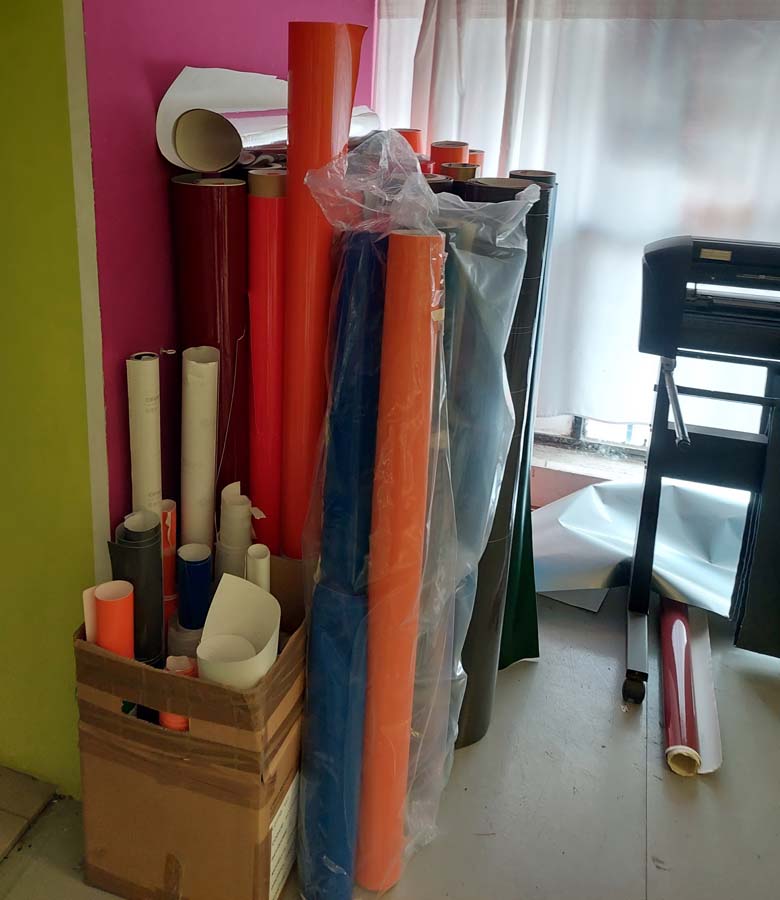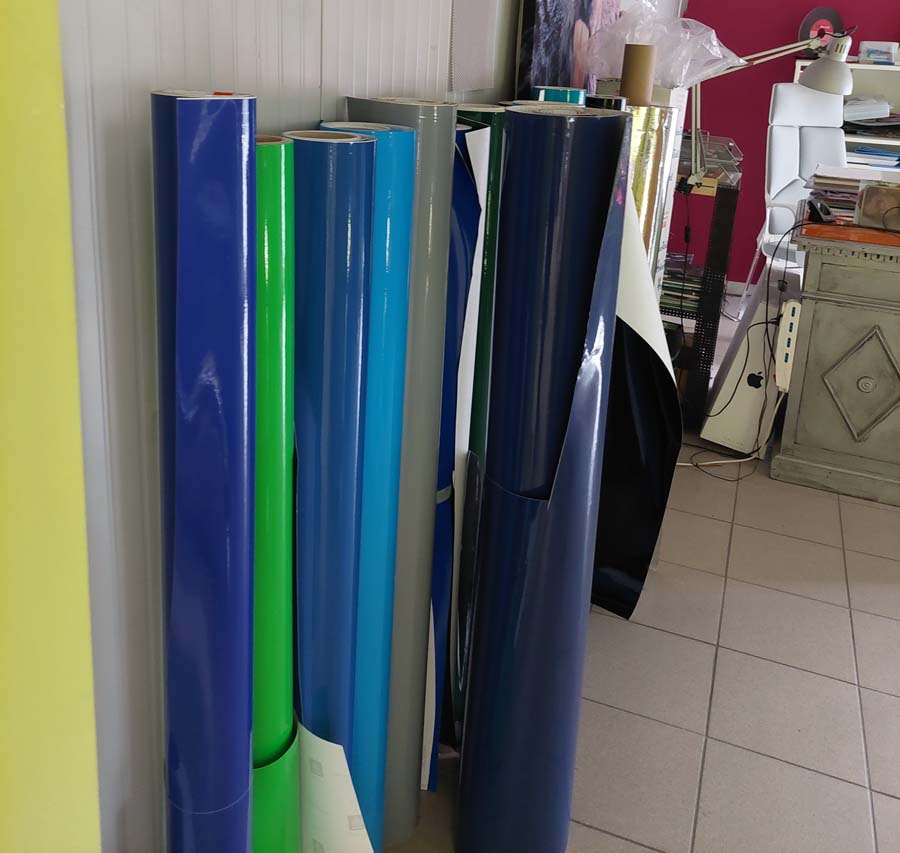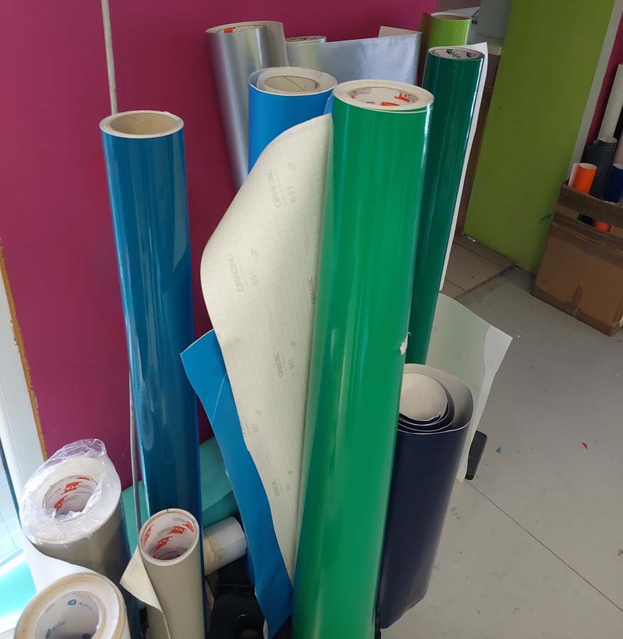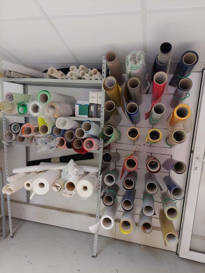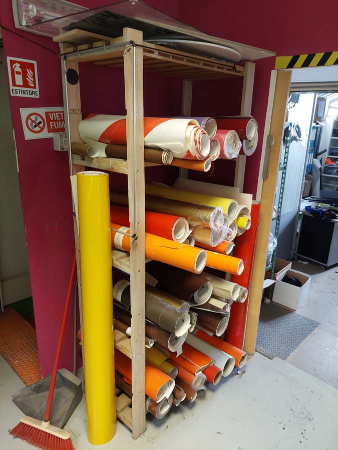 Lotto 88, 86) BOBINE PVC circa 360 rotoli vari tipi e formati, alcune nuove, la maggior parte utilizzate, espositore porta rotoli.