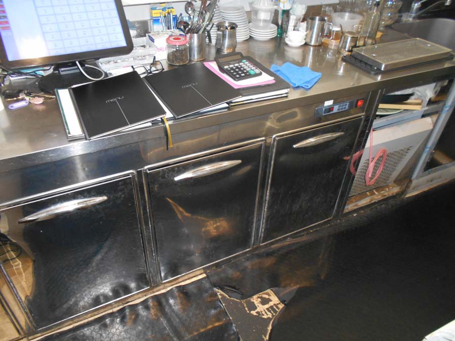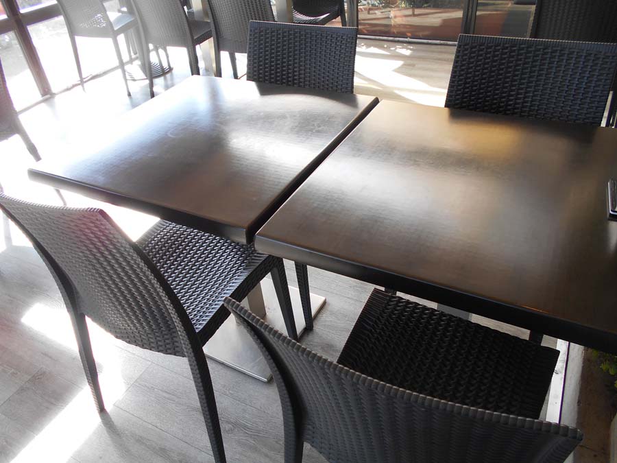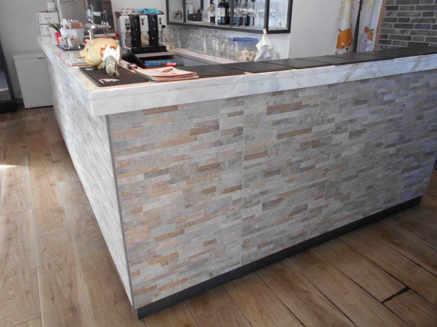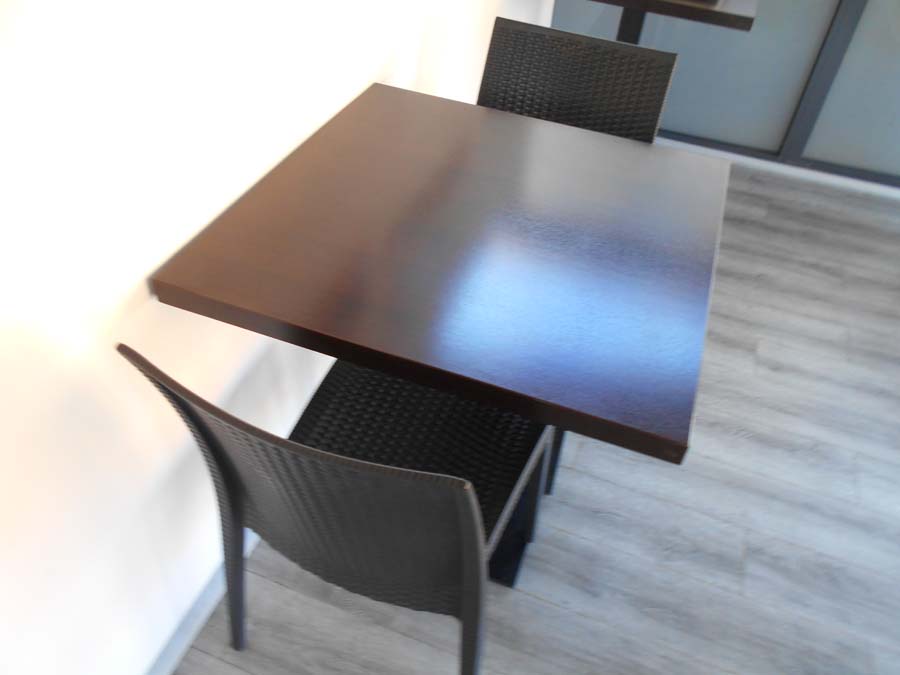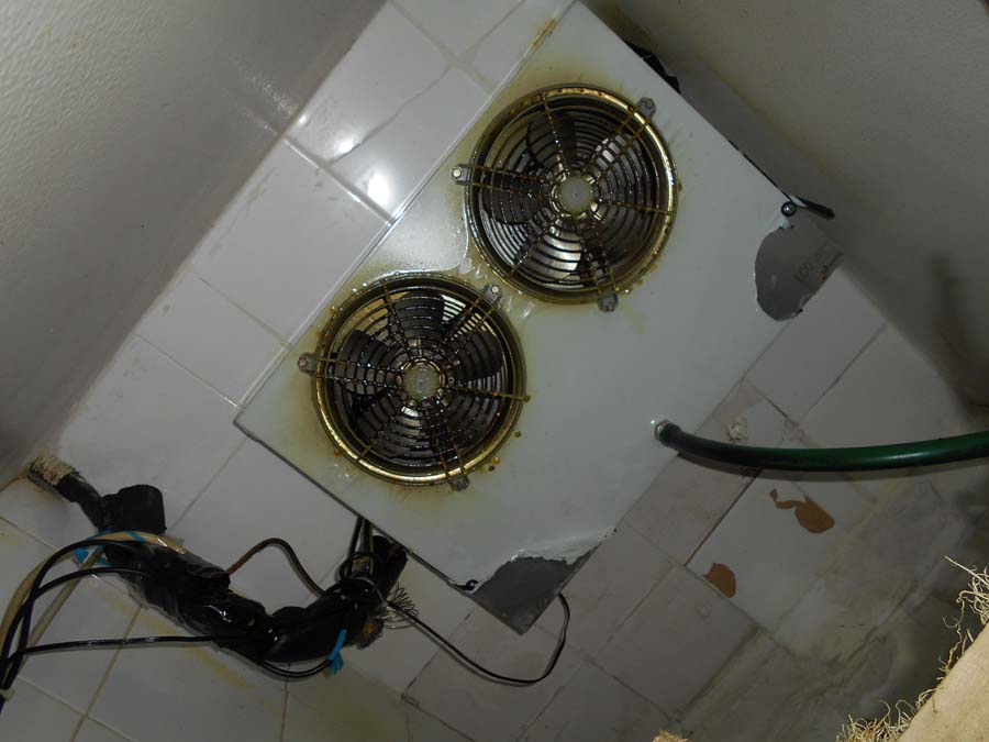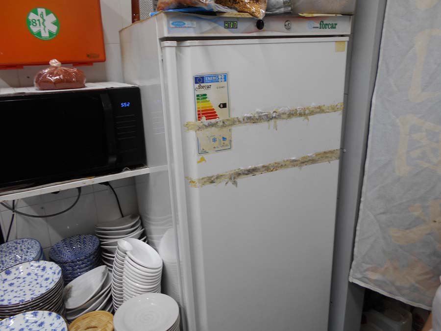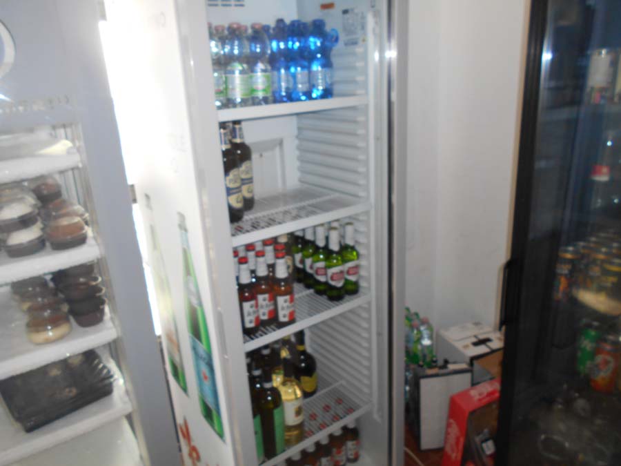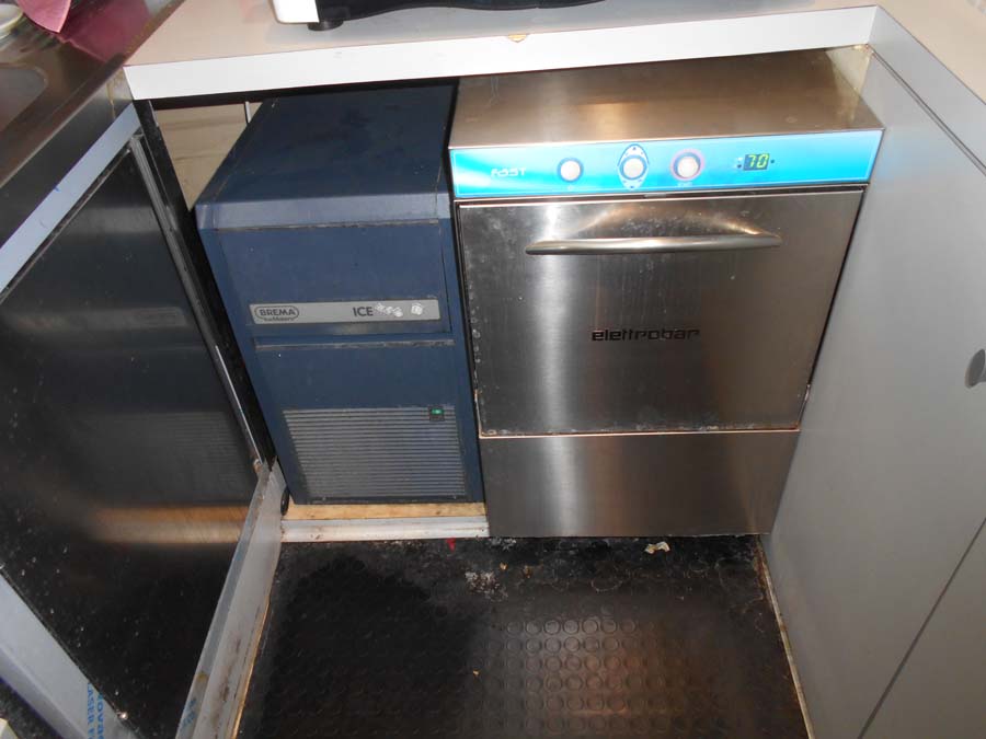 Banco frigo con piano in marmo con lavastoviglie, macchina del ghiaccio, lavello a 1 vasca, 3 sportelli refrigerati, pino in alluminio; frigo a 4 ripiani LLG; n. 10 tavoli quadrati da esterno in plastica colore nero con n. 20 sedie; ventilatore; lavastoviglie Becatti; cella frigorifero alta circa 2 metri con congelatore verticale.