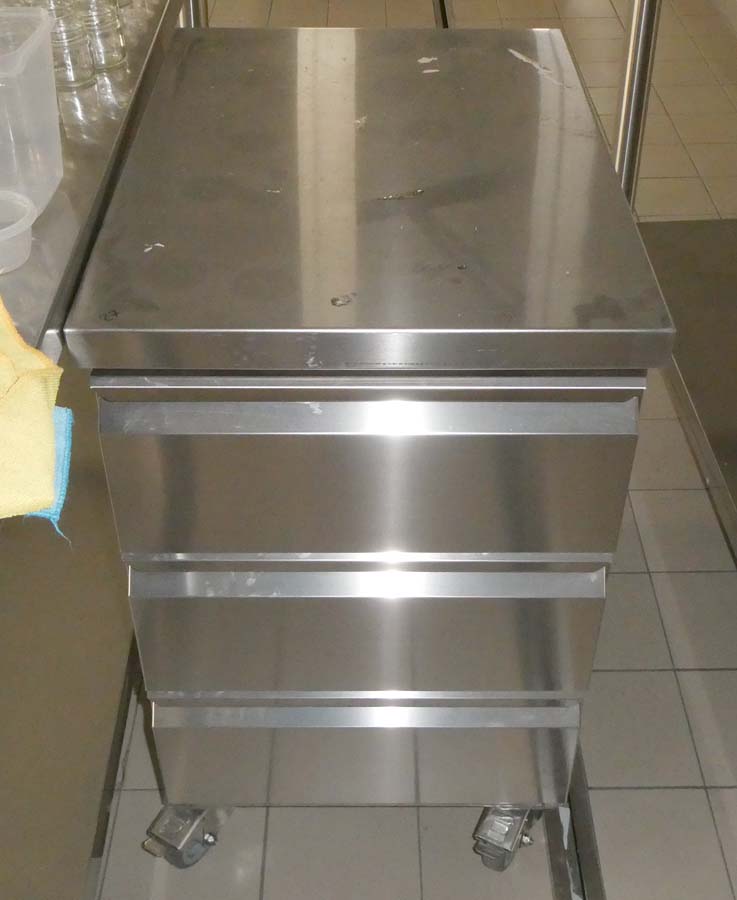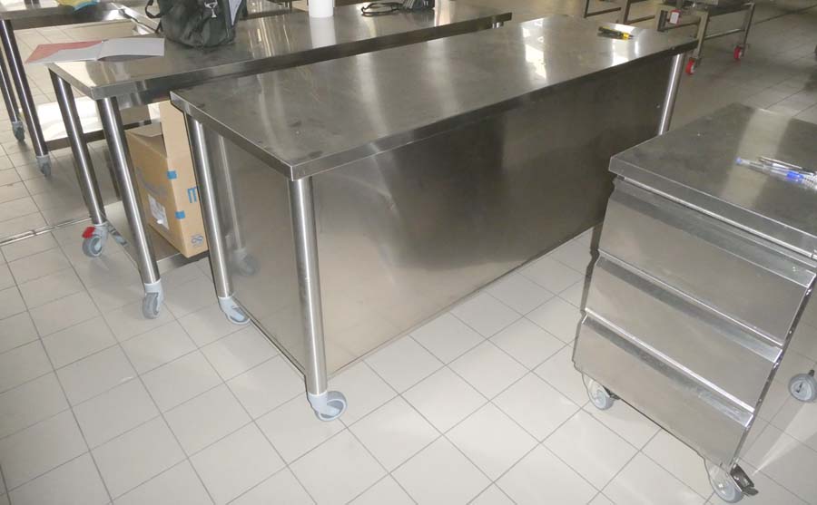 Lotto 26, 27) Mobile/banco in acciaio inox con ante scorrevoli, N. 2 cassettiere a tre cassetti in acciaio inox con ruote.