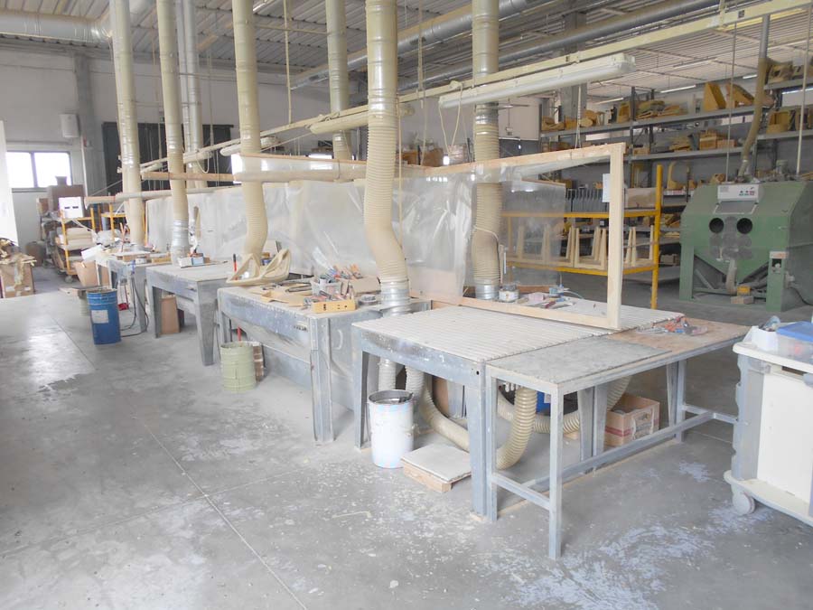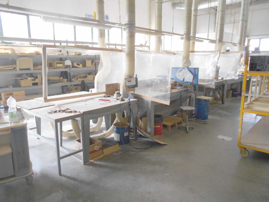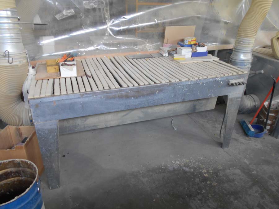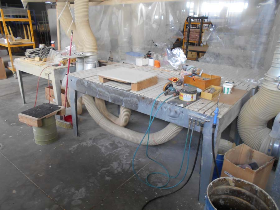 Lotto N. 62) N. 10 banchi aspiranti di costruzione artigianale, per lavorazioni di finitura, con aspirazione dal basso completi di piano di lavoro e canalizzazioni di allontanamento polveri.