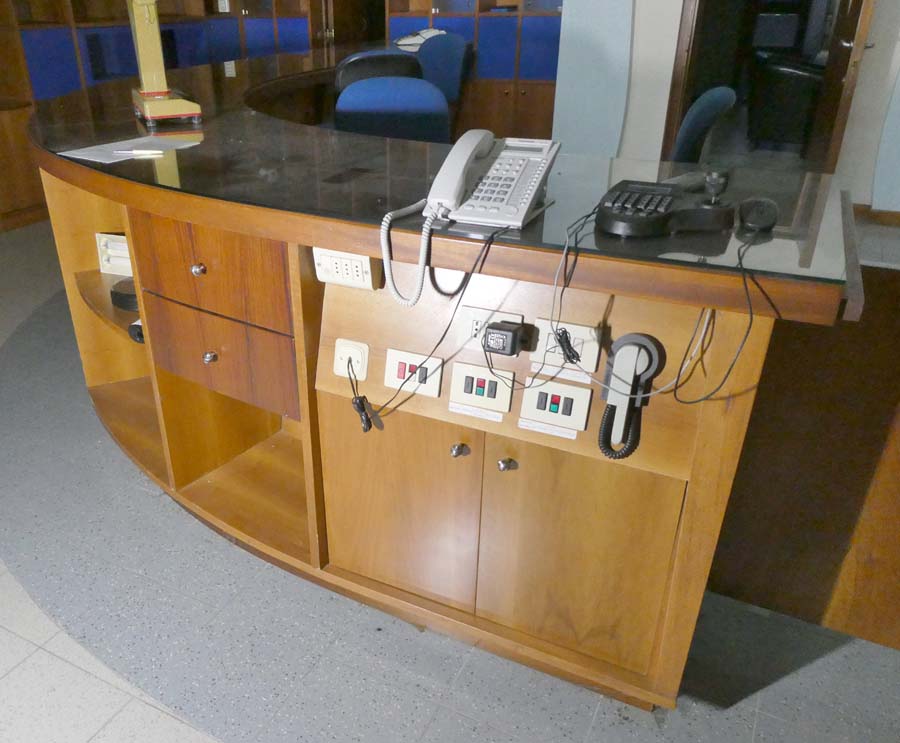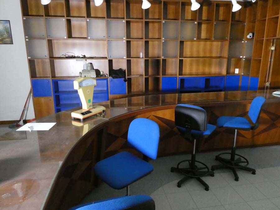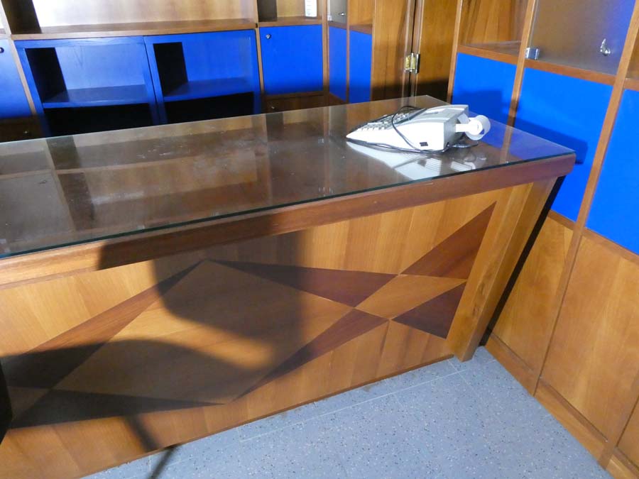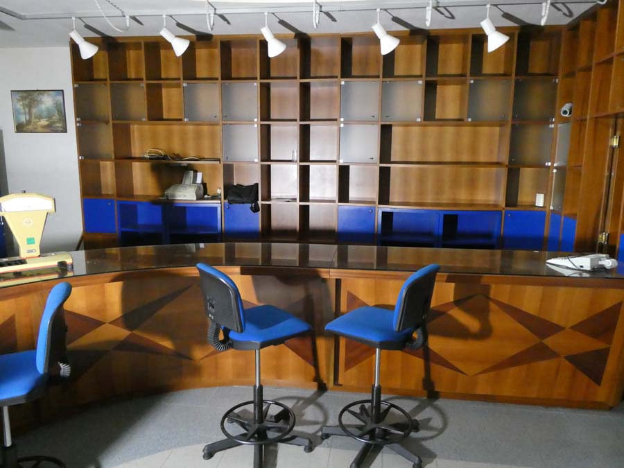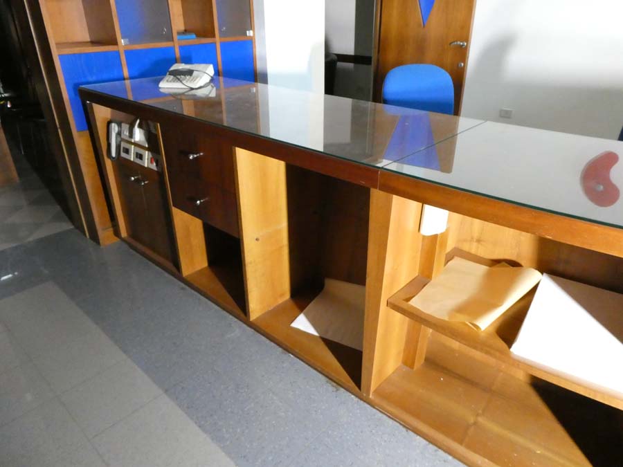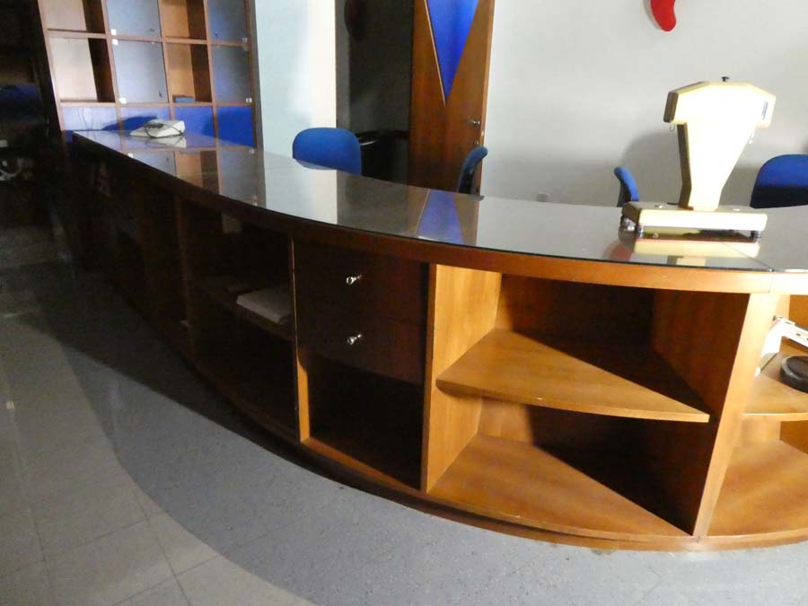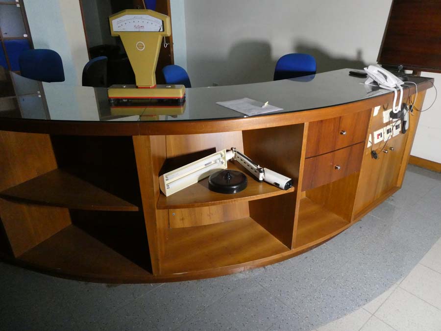 Lotto 4) Bancone a forma semicircolare che misura circa sei metri, in legno massello color scuro, dotato di appoggio in vetro con vani e cassettiere a 4 serie, in tessuto con ruote; bilancia marca "futura" (senza pesi), calcolatrice olimpia; armadiatura ad angolo in legno di circa 5,20 x 2,80 m con porta oltre a due mobili bianchi in legno laccato (truciolare); armadiatura angolare di m 3,20 x 2,60 che funge da divisorio con porta; scrivania con ripiano in vetro e basamenti in materiale misto; tre poltrone in materiale misto tessuto blu e acciaio; calcolatrice; telefono fisso Panasonic e schermo irradio; armadiatura lineare di vari vani, con misura m 3,80 circa, oltre a scrivania in material...