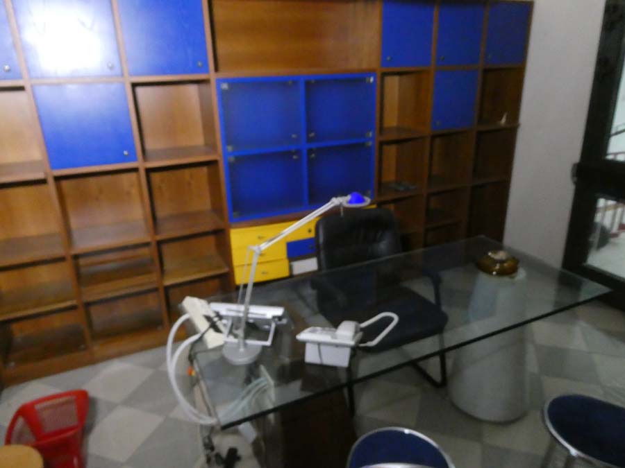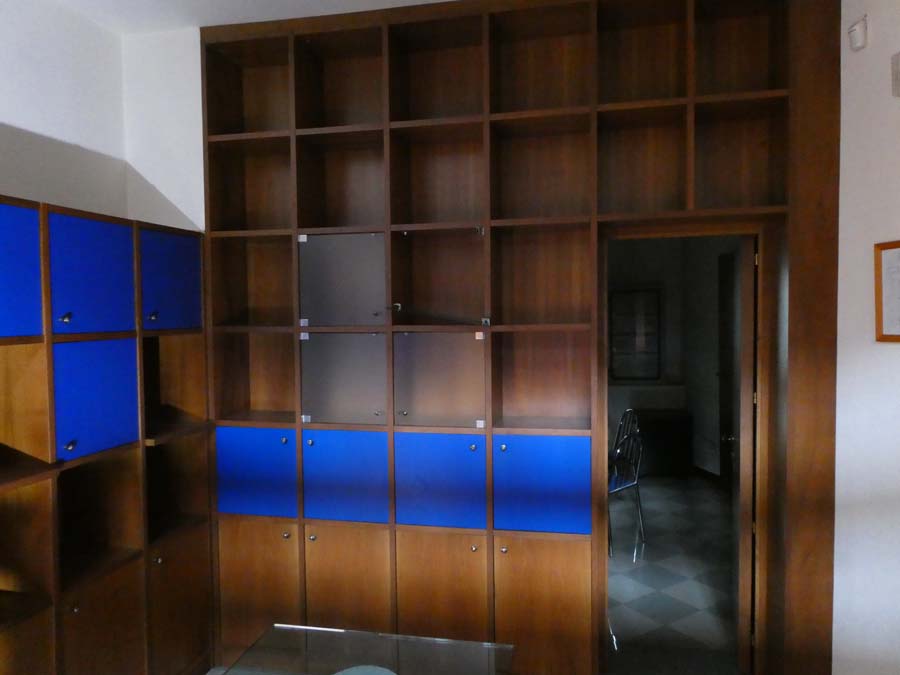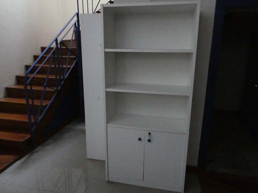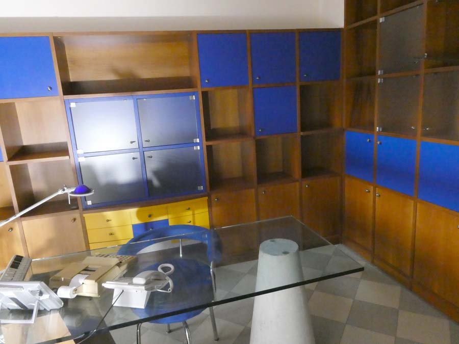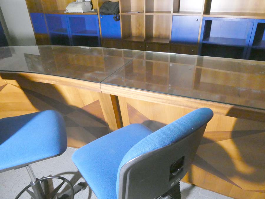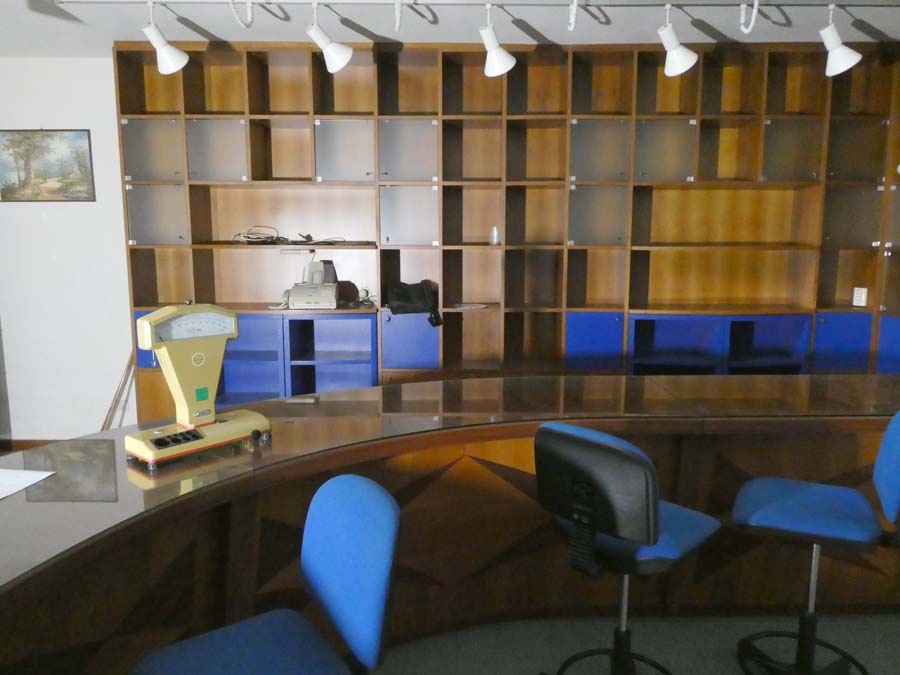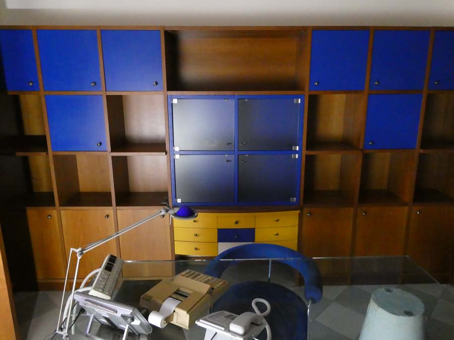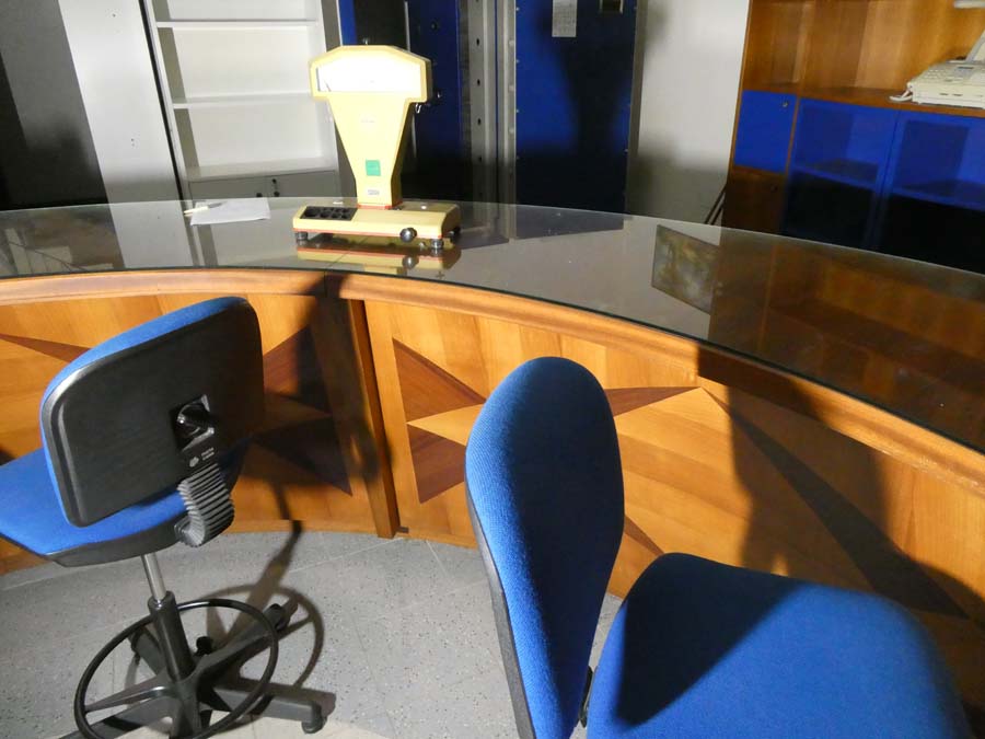 Lotto 4) Bancone a forma semicircolare che misura circa sei metri, in legno massello color scuro, dotato di appoggio in vetro con vani e cassettiere a 4 serie, in tessuto con ruote; bilancia marca "futura" (senza pesi), calcolatrice olimpia; armadiatura ad angolo in legno di circa 5,20 x 2,80 m con porta oltre a due mobili bianchi in legno laccato (truciolare); armadiatura angolare di m 3,20 x 2,60 che funge da divisorio con porta; scrivania con ripiano in vetro e basamenti in materiale misto; tre poltrone in materiale misto tessuto blu e acciaio; calcolatrice; telefono fisso Panasonic e schermo irradio; armadiatura lineare di vari vani, con misura m 3,80 circa, oltre a scrivania in material...