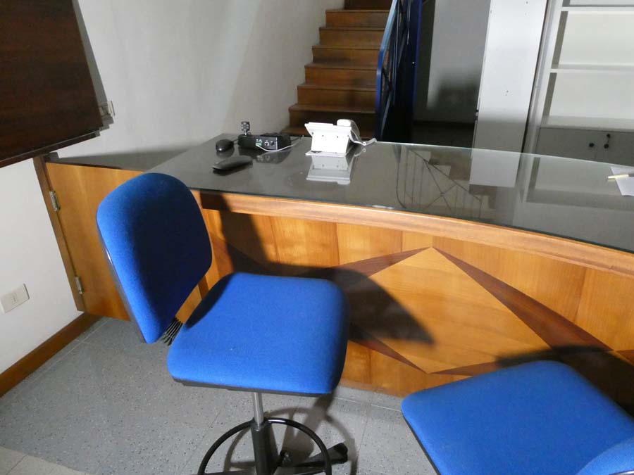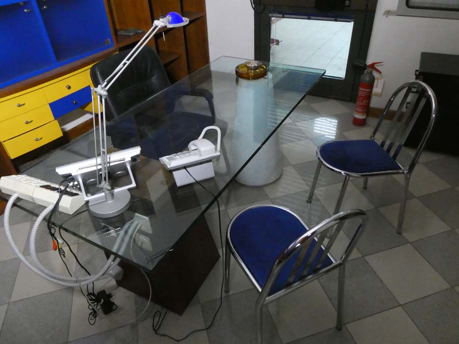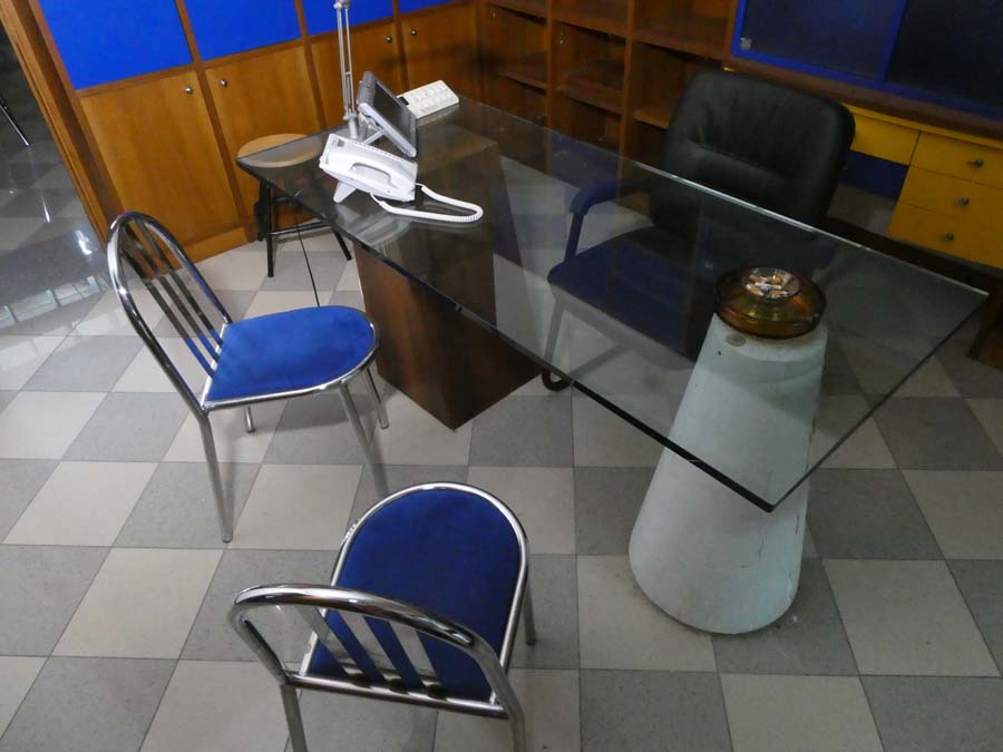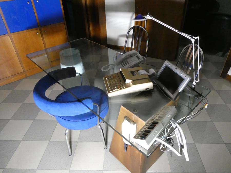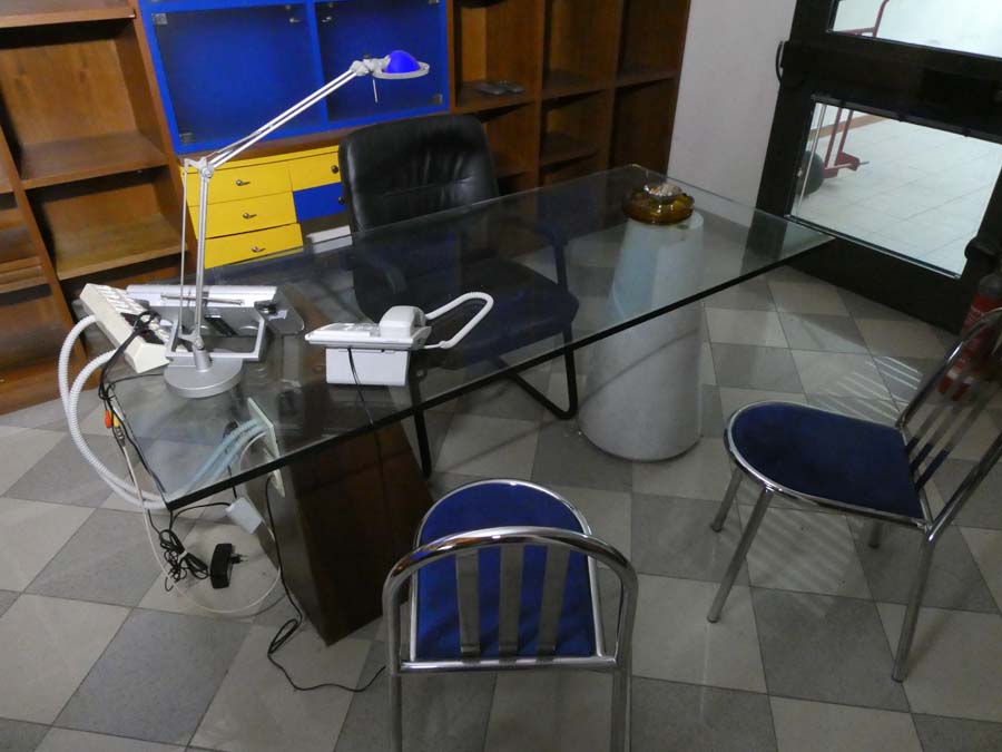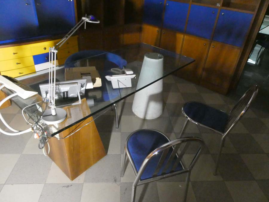 Lotto 4) Bancone a forma semicircolare che misura circa sei metri, in legno massello color scuro, dotato di appoggio in vetro con vani e cassettiere a 4 serie, in tessuto con ruote; bilancia marca "futura" (senza pesi), calcolatrice olimpia; armadiatura ad angolo in legno di circa 5,20 x 2,80 m con porta oltre a due mobili bianchi in legno laccato (truciolare); armadiatura angolare di m 3,20 x 2,60 che funge da divisorio con porta; scrivania con ripiano in vetro e basamenti in materiale misto; tre poltrone in materiale misto tessuto blu e acciaio; calcolatrice; telefono fisso Panasonic e schermo irradio; armadiatura lineare di vari vani, con misura m 3,80 circa, oltre a scrivania in materiale misto con due sedie in tessuto blu e metallo, poltrona in similpelle nera, cassettiera a tre cassetti color marrone e nero.