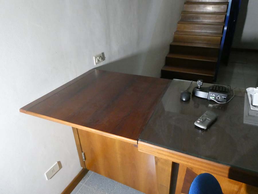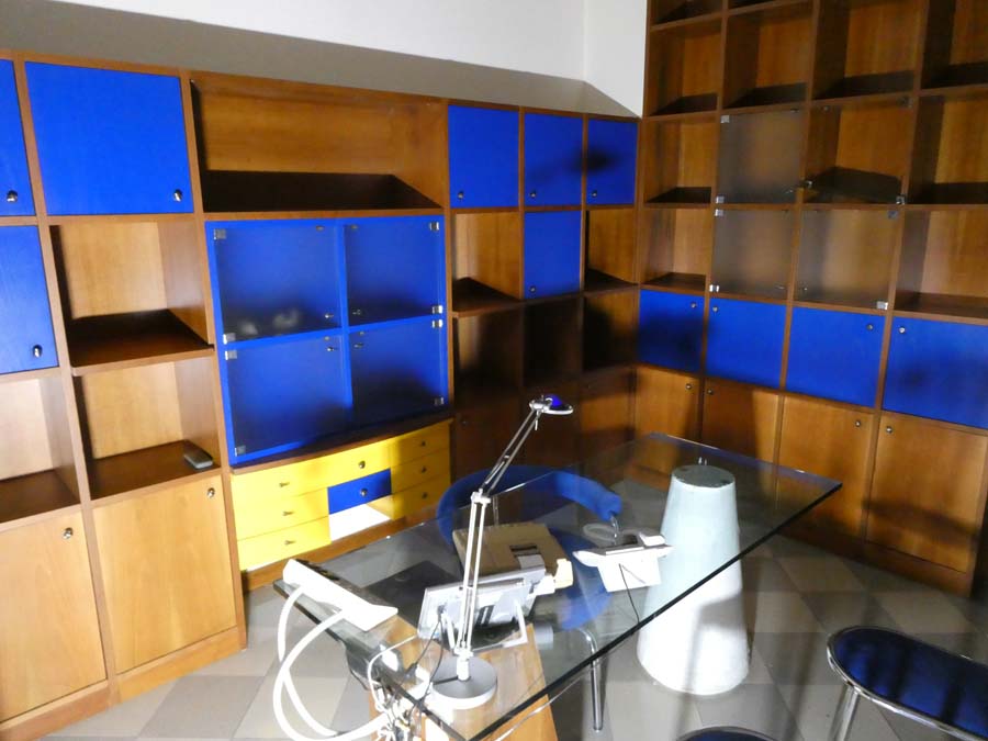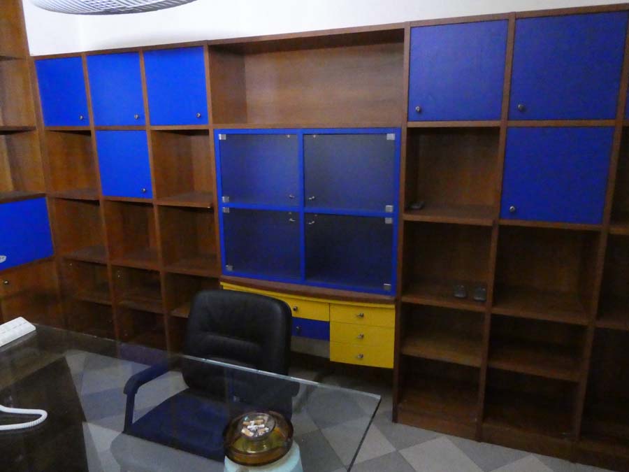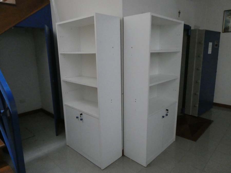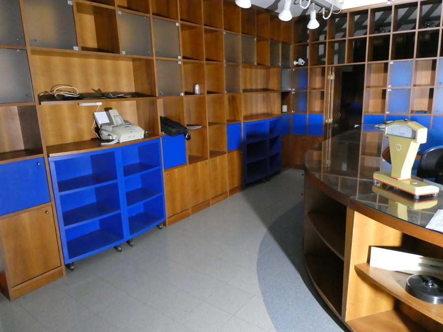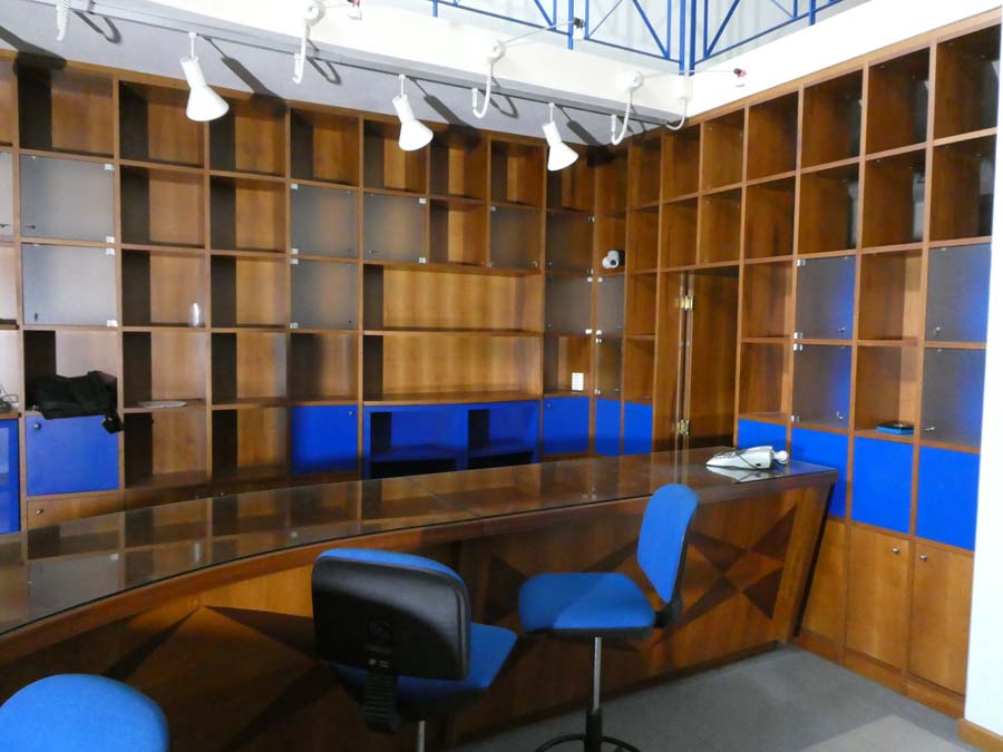 Lotto 4) Bancone a forma semicircolare che misura circa sei metri, in legno massello color scuro, dotato di appoggio in vetro con vani e cassettiere a 4 serie, in tessuto con ruote; bilancia marca "futura" (senza pesi), calcolatrice olimpia; armadiatura ad angolo in legno di circa 5,20 x 2,80 m con porta oltre a due mobili bianchi in legno laccato (truciolare); armadiatura angolare di m 3,20 x 2,60 che funge da divisorio con porta; scrivania con ripiano in vetro e basamenti in materiale misto; tre poltrone in materiale misto tessuto blu e acciaio; calcolatrice; telefono fisso Panasonic e schermo irradio; armadiatura lineare di vari vani, con misura m 3,80 circa, oltre a scrivania in materiale misto con due sedie in tessuto blu e metallo, poltrona in similpelle nera, cassettiera a tre cassetti color marrone e nero.