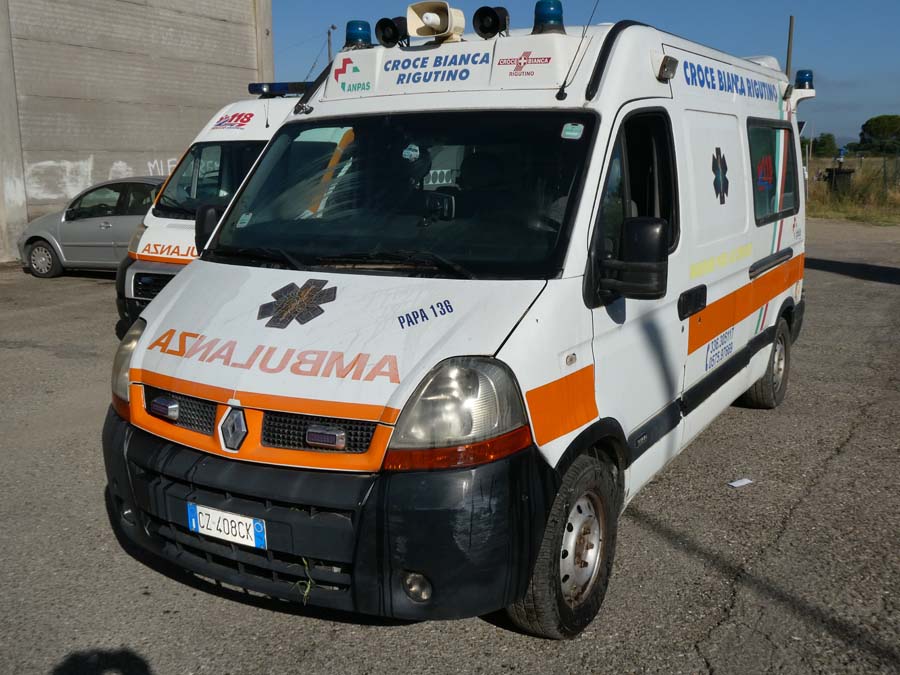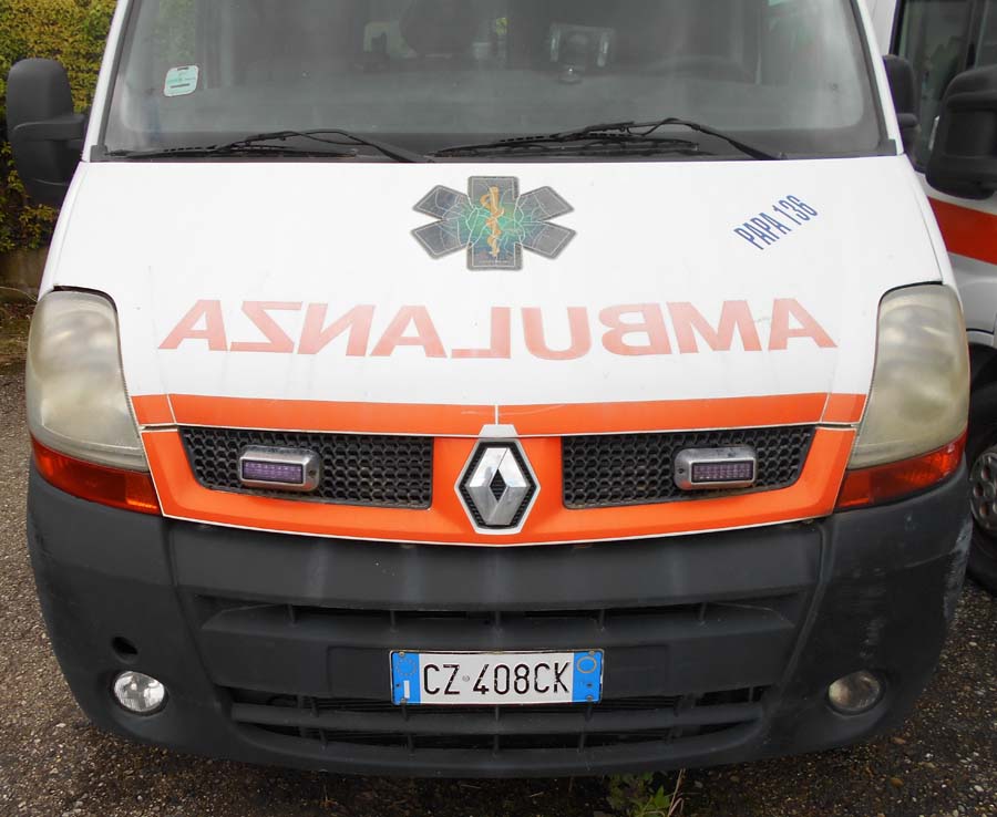 Lotto 4) Autoveicolo Renault targato CZ 408 CK, privato per uso speciale furgone ambulanza, data immatricolazione 10/03/2006, kw 84,00, alimentazione gasolio, cilindrata 2463. Vetro posteriore rotto e urti sulla carrozzeria. Alla data di ultima revisione del 10/01/2022 i chilometri percorsi risultano 264.785. Il mezzo è provvisto di chiave e mancante di documenti.