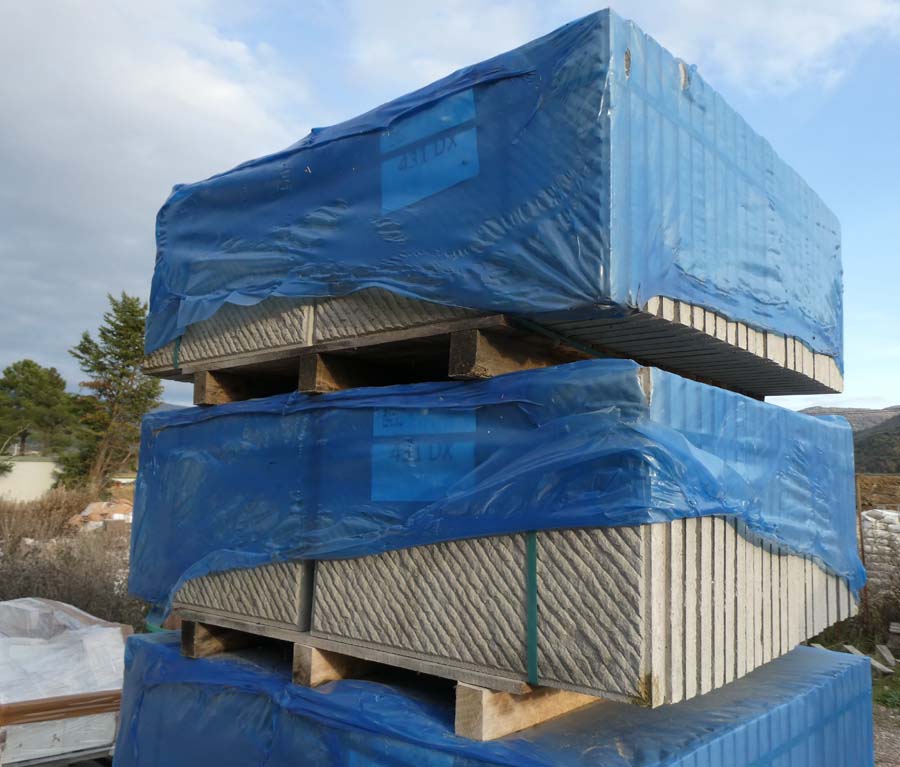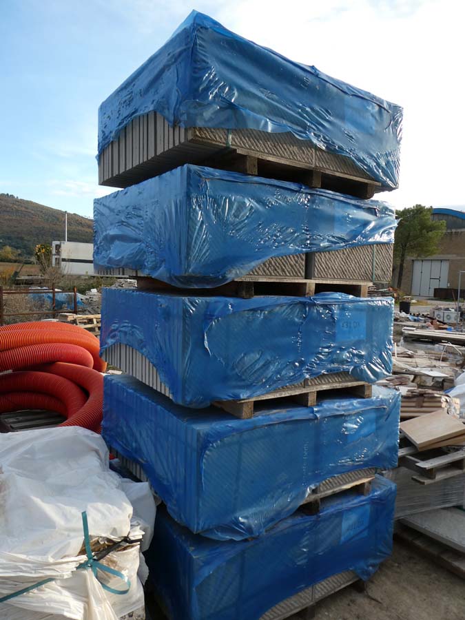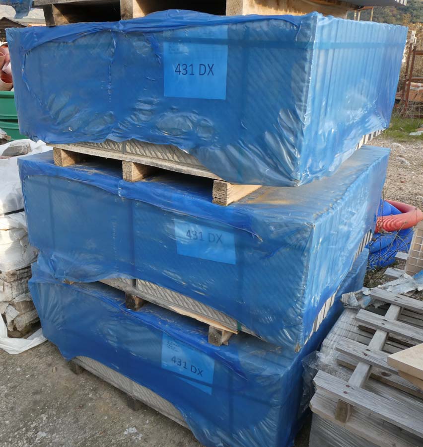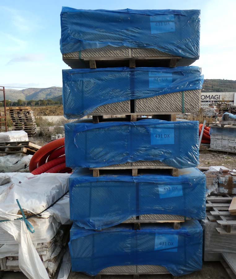 Pavimentazione in cemento disposta su n. 5 pancali per un totale di 260 lastre, prodotti nuovi ancora imballati.