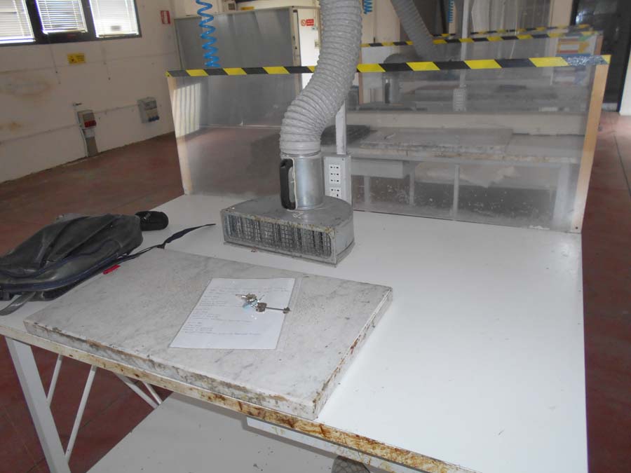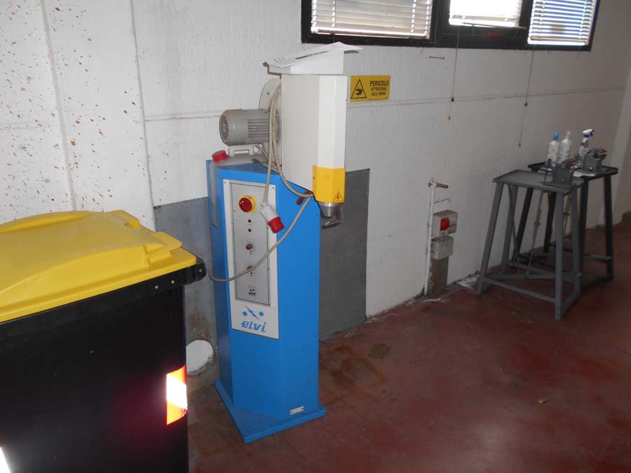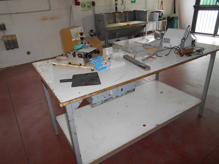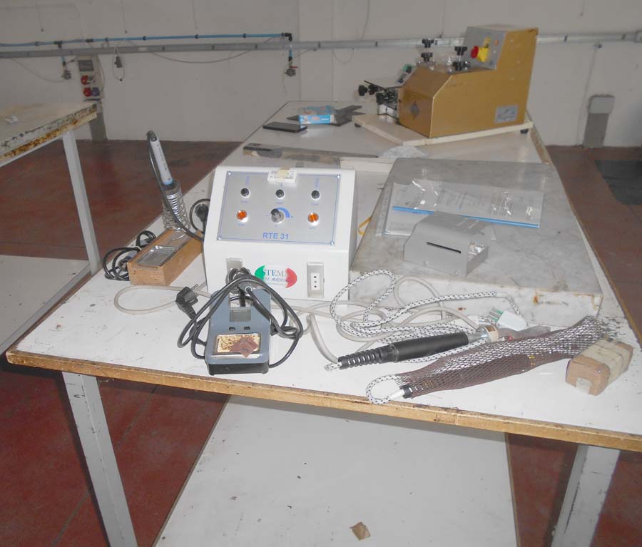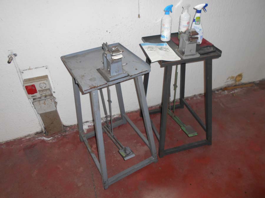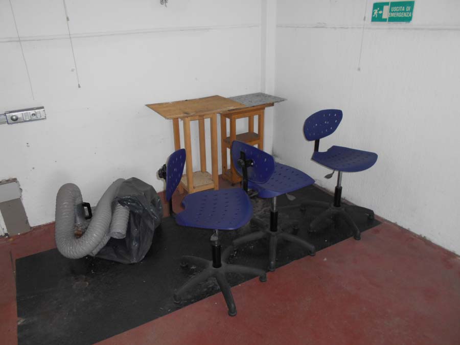 Lotto 2) N. 2 condizionatori composti da unità interna ed esterna, Aspiratore dismesso, Materiale per aspirazione dismesso, N. 4 banchi da lavoro con aspirazione, Banco da lavoro con macchinario lattice Satum, Regolatore di temperatura RTE 31 e 4 stazioni per lavorazione pelle, banco per incollaggio aspirante marca Intercom, banco su ruote con tingi bordo Omac, bidone immondizia, soffione Elvi, n. 2 pinze a pedale manuale, n. 3 armadietti per spogliatoio, stufetta elettrica, due scrivanie e tre sedie, n. 5 sgabelli e 2 banchetti artigianali.