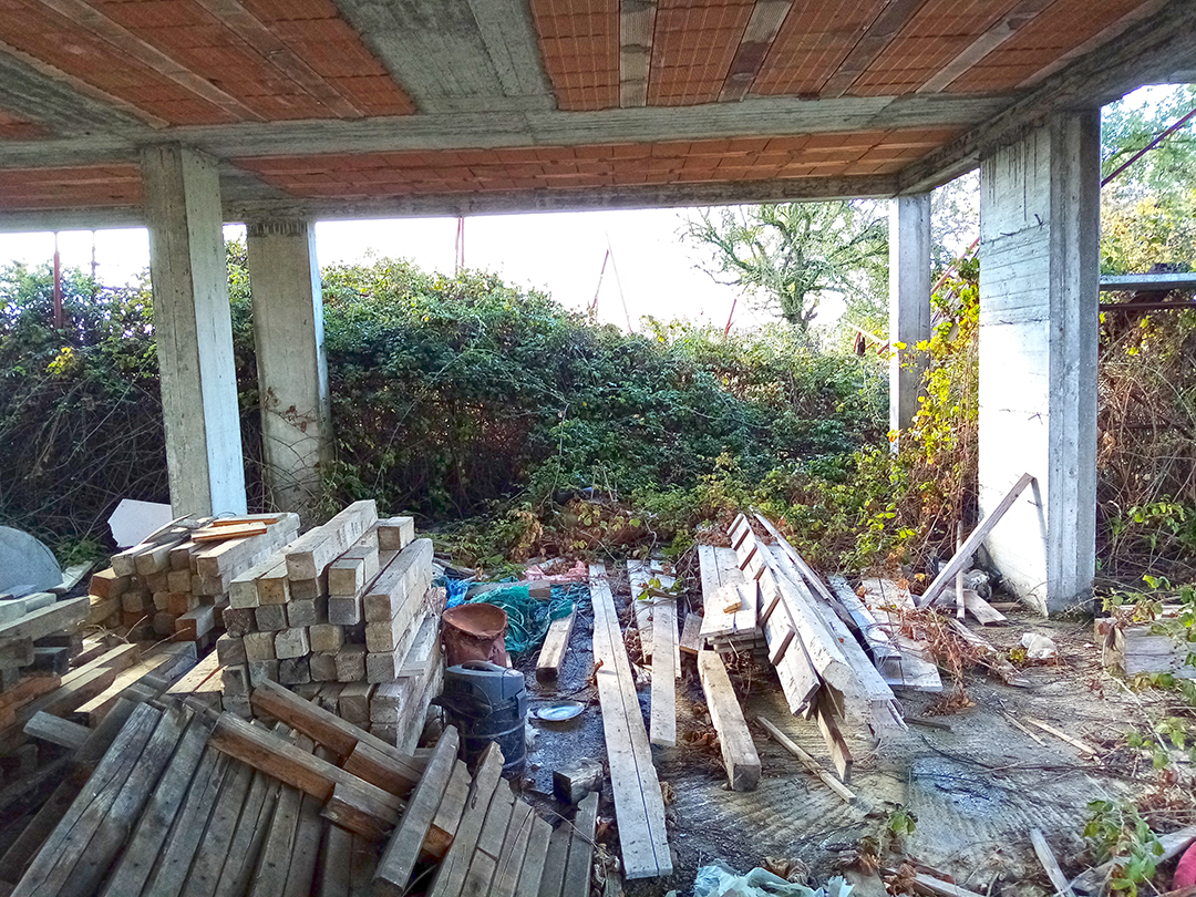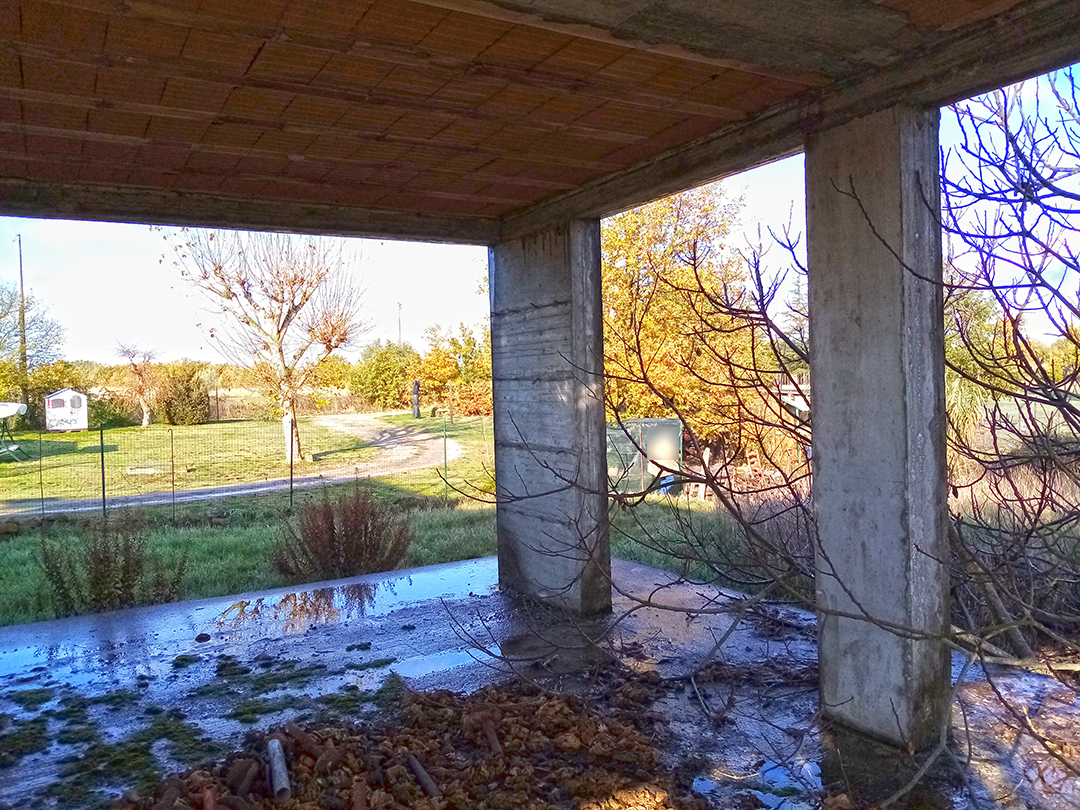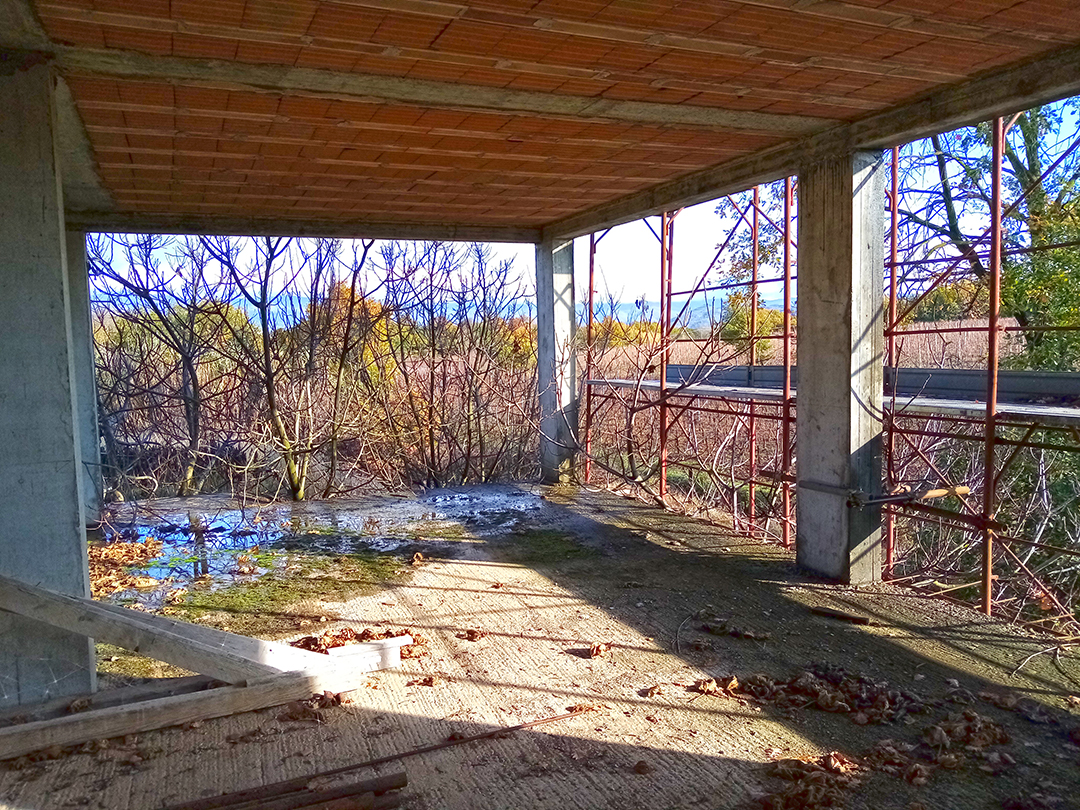 Fabbricato allo stato grezzo con destinazione d’uso residenziale, su due piani fuori terra ed uno interrato, costituito da due alloggi di civile abitazione e garages al piano seminterrato, ma allo stato attuale definito essenzialmente dal solo “scheletro” strutturale senza la tamponatura di pareti perimetrali, privo di tramezzature interne e di qualsiasi impianto tecnologico ed allacci alle utenze, e privo della scala interna di collegamento tra il piano terra ed il piano primo, oltre a pertinente resede, di superficie inferiore a mq. Cinquemila, che circonda il fabbricato su tutti i lati.